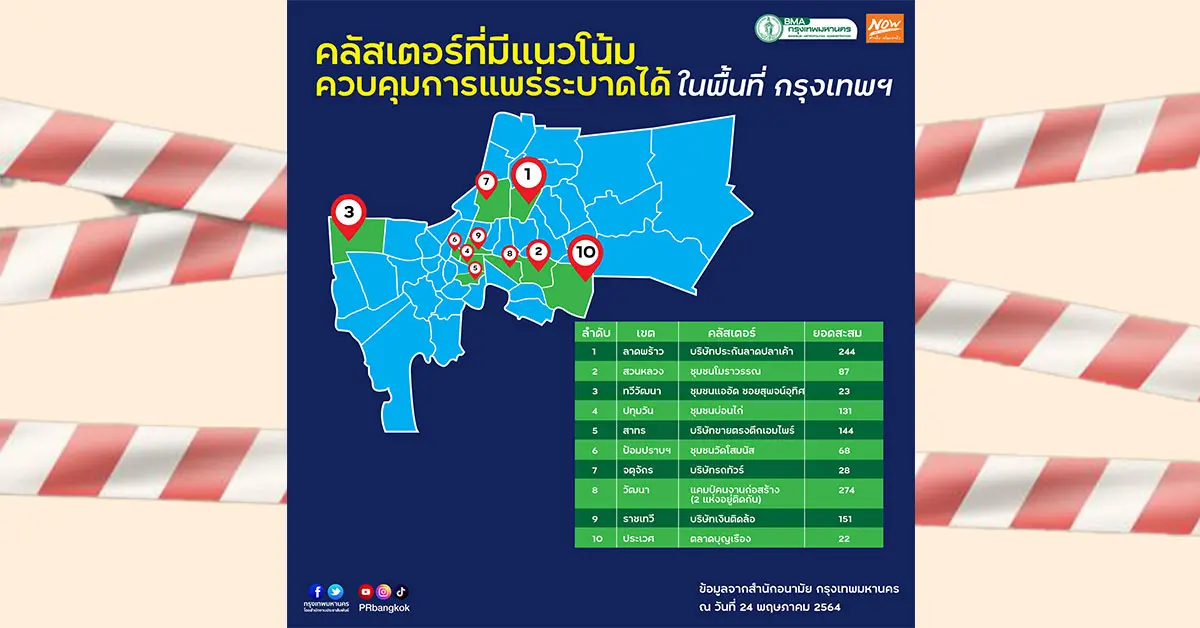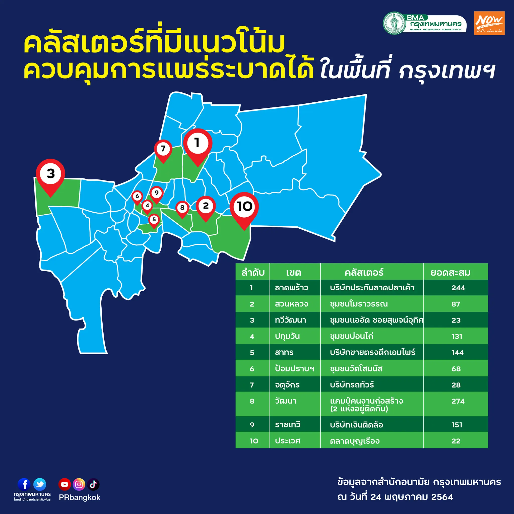 ทางสำนักงานประชาสัมพันธ์ กรุงเทพมหานคร เปิดเผยรายชื่อ 10 คลัสเตอร์ ที่มีแนวโน้ม ควบคุมการระบาด ของเชื้อโควิด-19