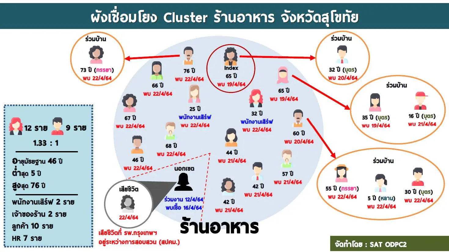 โดยนพ.ทวีศิลป์ ได้ยกตัวอย่างของคลัสเตอร์ร้านอาหาร จังหวัดสุโขทัย พบว่ามีการติดเชื้อรวมกันถึง 21 ราย มี 14 รายที่เชื่อมโยงกับร้านอาหารและนำไปสู่การติดเชื้อในครอบครัว และคลัสเตอร์กลุ่มนี้ก็มีส่วนที่เชื่อมโยงมาจากคลัสเตอร์ของ กทม. เช่นกัน