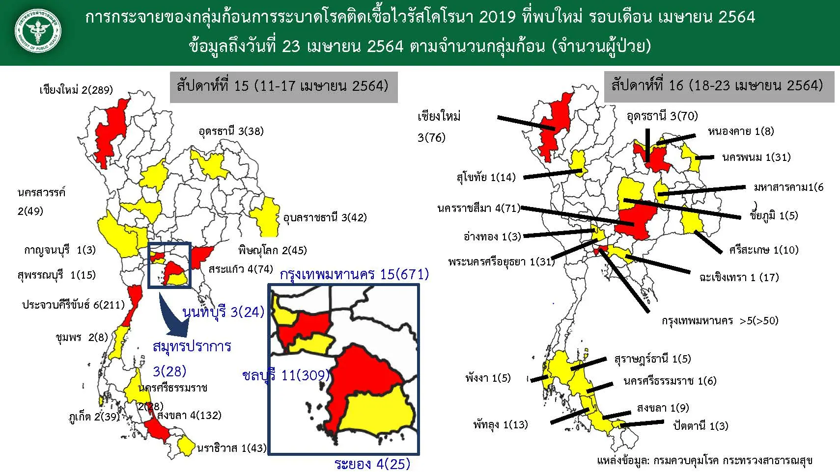 วันที่ 24 เม.ย. 64 ศูนย์บริหารสถานการณ์โควิด-19 โดย นพ.ทวีศิลป์ วิษณุโยธิน โฆษกศูนย์บริหารสถานการณ์โควิด-19 (ศบค.) ได้เปอดเผยถึงกรณีของการแพร่ระบาดเชื้อไวรัสโควิด-19 ทั่วประเทศ ณ ขณะนี้ว่า พบกลุ่มคลัสเตอร์กว่า 20 กลุ่มกระจายอยู่ใน 19 ตังหวัดทั่วประเทศ โดยในจังหวัด สุโขทัย เชียงใหม่ พระนครศรีอยุธยา โดยเฉพาะ กทม. มีมากกว่า 5 คลัสเตอร์มากกว่า 50 คน ทั้งหมดได้รายงานและติดตามกันอย่างใกล้ชิด