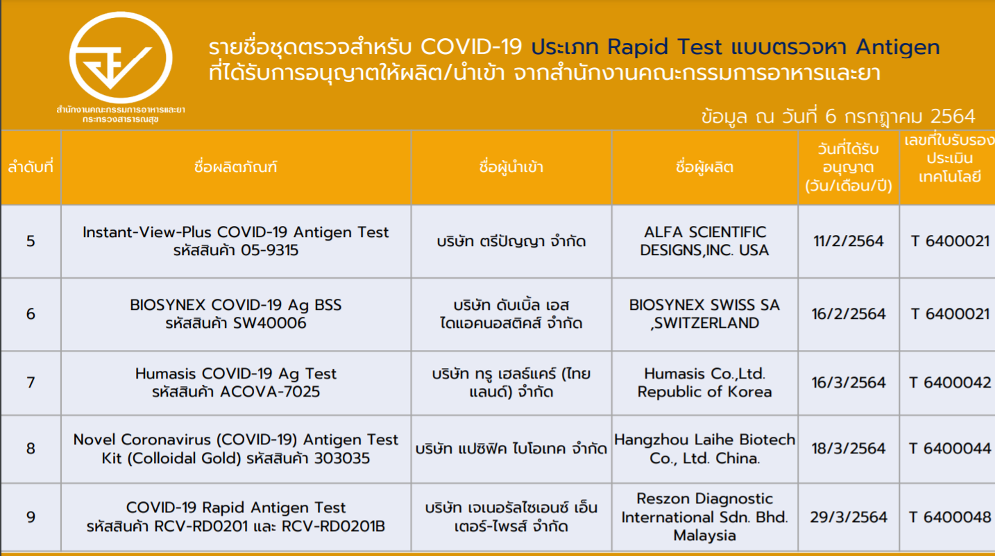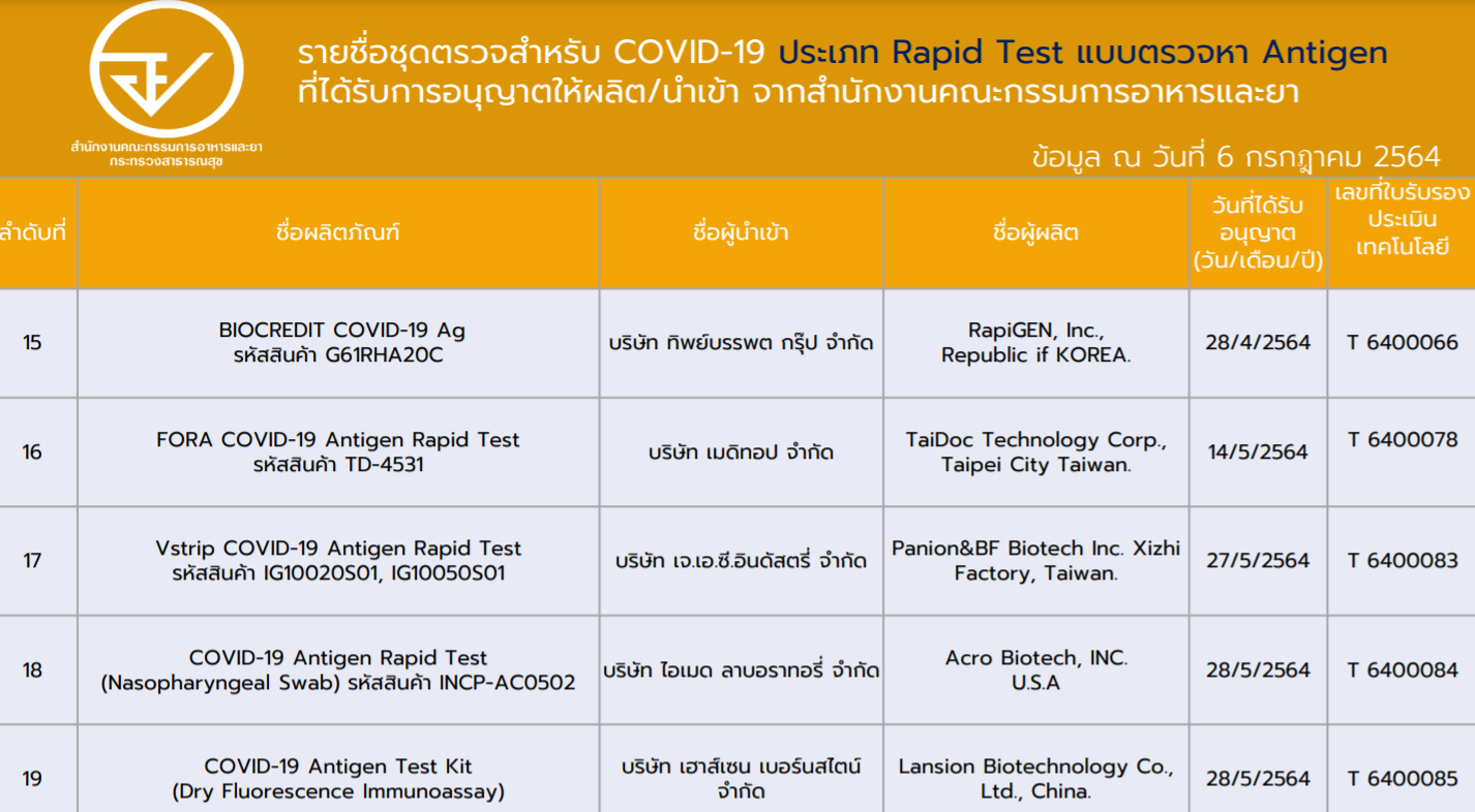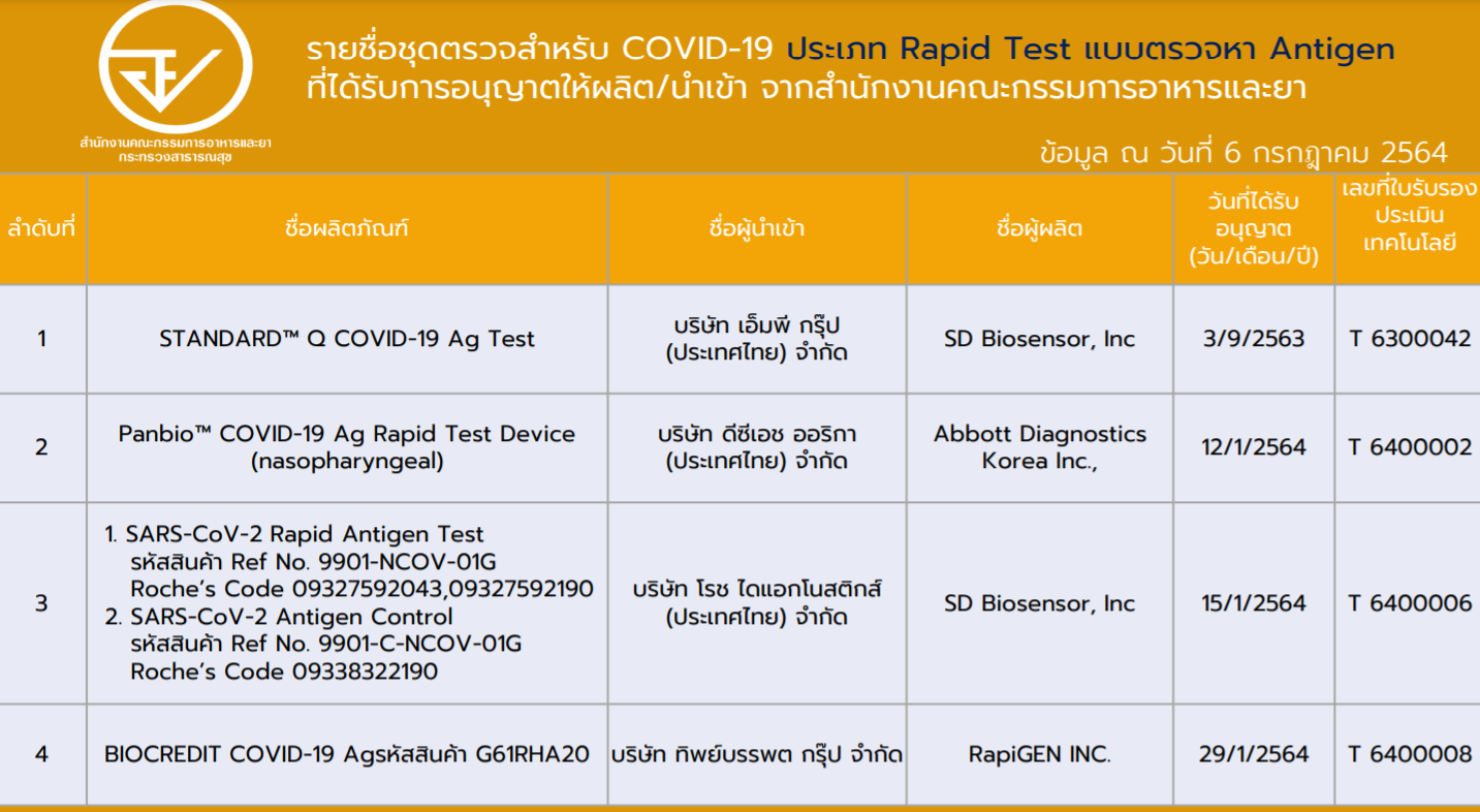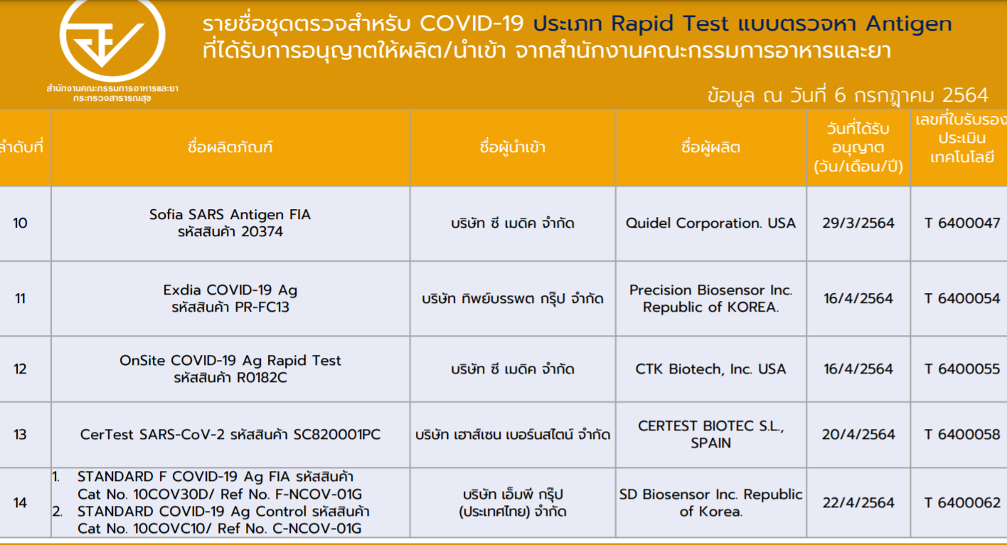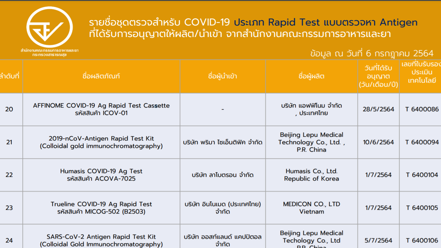 ล่าสุด สำนักงานคณะกรรมการอาหารและยา หรือ อย. ได้เปิดเผยรายชื่อชุดตรวจโควิด-19 ประเภท Rapid Test แบบตรวจหา Antigen ที่ได้รับการอนุญาตให้ผลิตและนำเข้า จาก อย. ทั้ง 24 ผลิตภัณฑ์ ดังนี้
