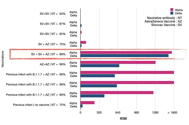 จากการศึกษาเบื้องต้นพบว่า Sinovac 2 เข็มแม้ระดับ Neutralize antibody ขึ้น 80-90% แม้ว่าจะวัดระดับภูมิคุ้มกันต่อสายพันธ์ุแอลฟาได้บ้างแต่ไม่สามารถป้องกันสายพันธุ์เดลตาได้เลย แต่ในคนที่ได้ AZ ครบ 2 เข็มและมีระดับ Neutralize antibody ที่สูงเกิน 90% สามารถป้องกันสายพันธุ์เดลตาได้ดีระดับหนึ่งและ