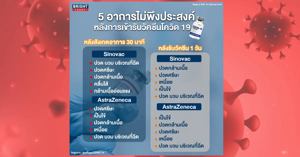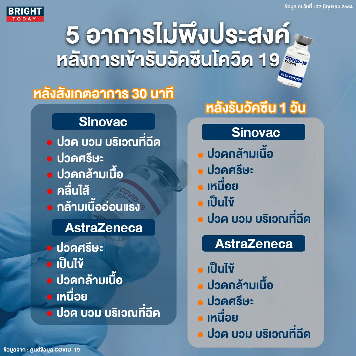 ศบค.เผย 5 อาการไม่พึงประสงค์ หลังฉีดวัคซีน “ซิโนแวค-แอสตร้าเซนเนก้า” ในระบบหมอพร้อม 30 นาทีแรก และ 1 วันต่อมา