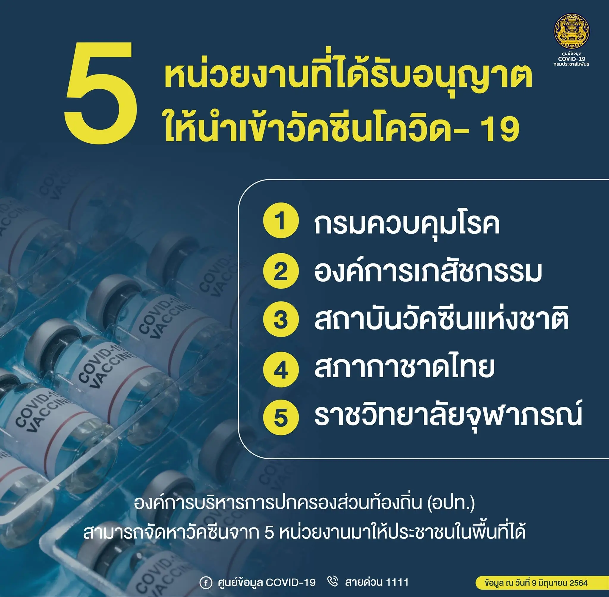 เพื่อเร่งรัดให้การขับเคลื่อนการฉีดวัคซีนป้องกันโรคโควิด19 ตามวาระแห่งชาติไปสู่การปฏิบัติ อย่างเป็นรูปธรรมมีประสิทธิภาพ และประชาชนได้รับประโยชน์โดยเร็ว เป็นไปตามมาตรการเร่งรัด โดยข้อเสนอของศูนย์ปฏิบัติการ ศูนย์บริหารสถานการณ์โควิด19 และคณะทำงานพิจารณาการจัดหาวัคซีนป้องกัน โรคโควิด19 จึงได้กำหนด 5 หน่วยงานที่ได้รับอนุญาตให้นำเข้าวัคซีน ดังนี้