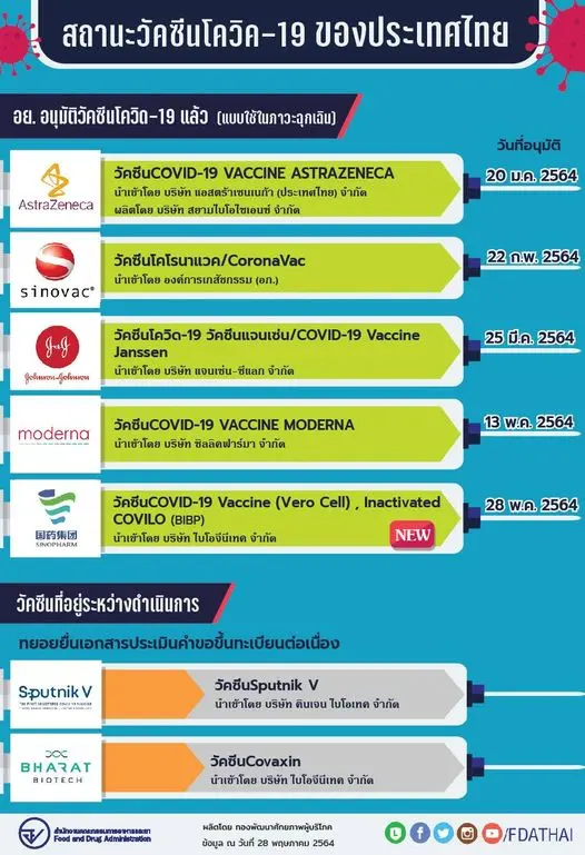 สรุปชัด! 5 วัคซีน โควิด-19 ที่ประเทศไทยนำเข้า และผ่านการ ขึ้นทะเบียน อย. เรียบร้อยแล้ว และอีก 2 วัคซีน กำลังดำเนินการอยู่