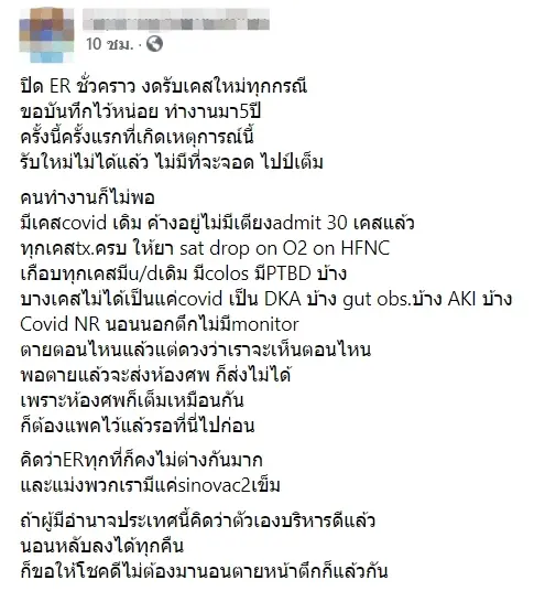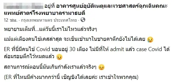 นอกจากนี้ยังได้มีผู้ใช้เฟซบุ๊กอีกรายระบุว่า “พยายามเต็มที่…แต่วันนี้เราไม่ไหวแล้วจริงๆแม้แต่เตียงคนไข้เคสล่าสุด จะเข็นเข้ามาในชายคาตึกยังไม่ได้เลย ER ที่นี่มีคนไข้ Covid นอนอยู่ 30 เตียง ไม่มีที่ให้ admit แล้ว case Covid ได้ล้อมรอบตึกไว้หมดแล้ว สถานการณ์ตอนนี้มันเกินกำลังเราแล้วจริงๆ (ER ที่ไหนมีค้างมากกว่านี้ เชิญขิงได้เลยค่ะ เราเข้าใจพวกคุณ)”
