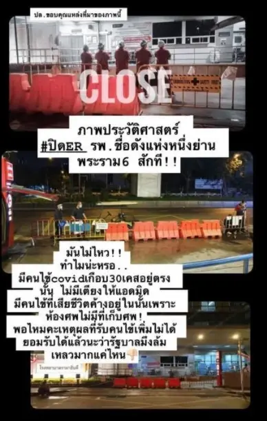 เมื่อวันที่ 25 กรกฎาคม ที่ผ่านมามีผู้ใช้เฟซบุ๊กรายหนึ่งได้โพสต์ข้อความถึงสถานการณ์รับผู้ป่วยโควิด-19 ของโรงพยาบาลแห่งหนึ่งที่มีคนไข้ล้นเกนกำลังของเจ้าหน้าที่จนต้องประกาศปิดแผนกฉุกเฉินงดรับผู้ป่วยทุกกรณี โดยผู้ใช้เฟซบุ๊กรายดังกล่าวได้ระบุข้อความเอาไว้ว่า