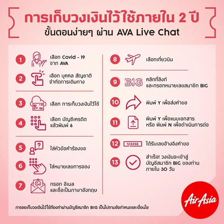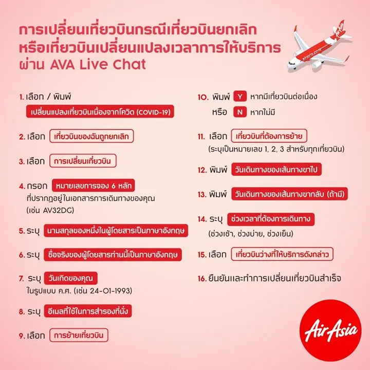 ทางแอร์เอเชีย พร้อมให้ความช่วยเหลือผู้โดยสารในการแก้ไขการจองดังกล่าว โดยท่านสามารถส่งรายละเอียด (ชื่อ-นามสกุลภาษาอังกฤษ, อีเมล, วันเดินทาง และเส้นทาง) มาได้ที่ https://forms.gle/wdg44qyKRC4jkhRQ8 ซึงขอสงวนสิทธิ์ดำเนินการเเก้ไขกรณีปลดล็อควันเดินทางเพื่อการสำรองที่นั่งใหม่เท่านั้น ทางแอร์เอเชียจะทำการตอบกลับผ่านทางอีเมลภายใน 3 วันทำการ หรือติดต่อผ่านเคาน์เตอร์จำหน่ายบัตรโดยสาร ณ ท่าอากาศยานที่แอร์เอเชียให้บริการ