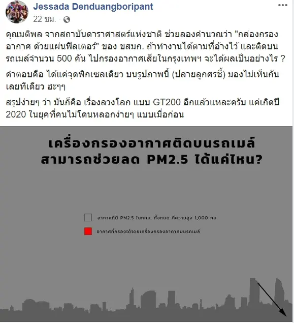 พร้อมกันนี้ รศ.ดร.เจษฎา ได้แชร์โพสต์และคอมเมนต์ประกอบโพสต์ของ คุณมติพล จากสถาบันดาราศาสตร์แห่งชาติ ช่วยลองคำนวณว่า “กล่องกรองอากาศ ด้วยแผ่นฟิลเตอร์” ของ ขสมก. ถ้าทำงานได้ตามที่อ้างไว้ และติดบนรถเมล์จำนวน 500 คัน ไปกรองอากาศเสียในกรุงเทพฯ จะได้ผลเป็นอย่างไร ?