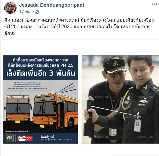 เครื่องฟอกอากาศ รศ.ดร.เจษฎา เด่นดวงบริพันธ์ อาจารย์ประจำภาควิชาชีววิทยา คณะวิทยาศาสตร์ จุฬาลงกรณ์มหาวิทยาลัย โพสต์ข้อความลงในเฟซบุ๊กส่วนตัว Jessada Denduangboripant ระบุว่า ครื่องฟอกอากาศบนหลังคารถเมล์ เป็นเรื่องลวงโลก แบบเดียวกับเครื่อง GT200