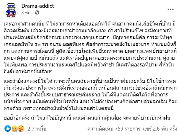 นอกจากนี้ เพจดังยังได้กว่าถึงกรณีที่เกิดขึ้นกับอาม่าทั้ง 3 คน ว่า “เคสอาม่าสามคนนั้น ที่ไม่สามารถหาเตียงแอดมิทได้ จนอาม่าคนนึงเสียชีวิตที่บ้าน นี่คือจุดเริ่มต้น เด๋วจะมีเคสแบบอาม่าตามมาอีกเยอะ ถ้าเราไม่รีบแก้ไข จะมีคนตายที่บ้านเหมือนสมัยอิตาลีตอนระบาดช่วงแรกๆเยอะมาก ปัญหาตอนนี้คือ การจะให้ทุกเคสแอดมิทใน รพ รพ สนาม ฮอสพิเทล คือถ้าการระบาดยังไม่เยอะมาก ทำแบบนั้นก็ถูก แต่สถานการณ์ตอนนี้ ผู้ติดเชื้อรายใหม่เพิ่มขึ้นมหาศาล บุคลากรแพทย์พยาบาลก็แทบจะสุดสายป่านกันแล้ว และเราติดปัญหาคอขวดตรงระบบการประสานงาน คู่สายไม่เพียงพอ การประสานงานส่งเคสไปแอดมิทยังล่าช้า มีเคสที่ต้องรอที่บ้าน สี่ห้าวันถึงสัปดาห์มากขึ้นเรื่อยๆ