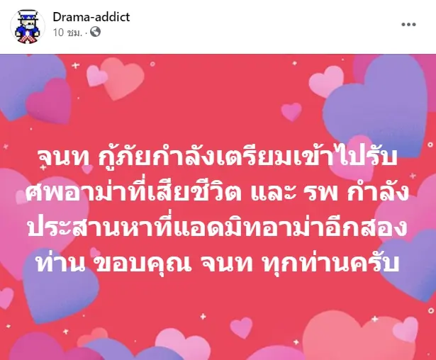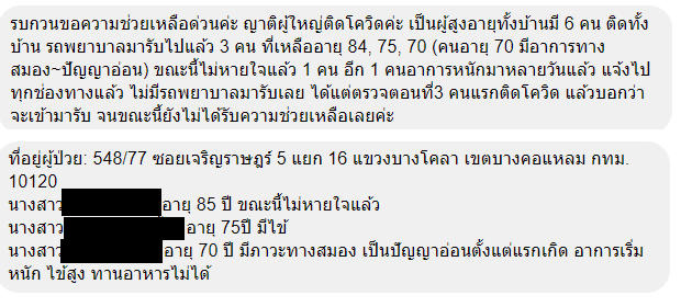 ต่อมาทางเพจได้มีการโพสต์ข้อความขอความช่วยเหลือจากลูกเพจ โดยได้ระบุข้อความว่า “ขอความช่วยเหลือหน่วยงานที่เกี่ยวข้อง ไปช่วยรับศพของผู้เสียชีวิตหน่อยครับผม เป็นเคสผู้เสียชีวิตจากโควิด แต่ยังไม่สามารถหารถมารับศพได้ อยู่ในพื้นที่เขตบางคอแหลม กทม ตอนนี้เสียชีวิตแล้ว 1 เริ่มมีอาการป่วยอีก 2 ติดต่อที่คุณ เบอร์ 02-2130415 ติดต่อคุณโส่ย นะครับ เป็นญาติของอาม่าทั้งสามคนนี้ (นี่คือเคสเดียวกับคลิปเมื่อตะกี้ครับ)”