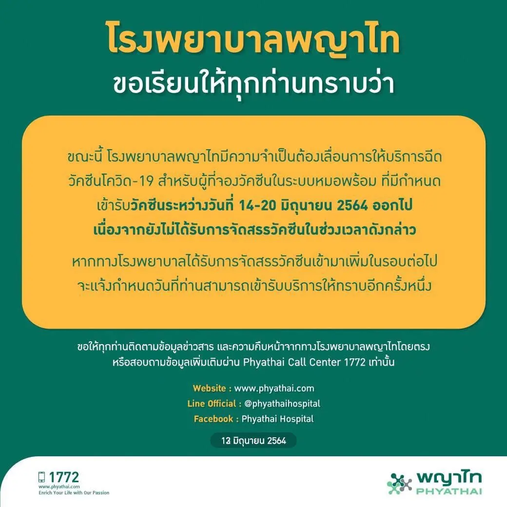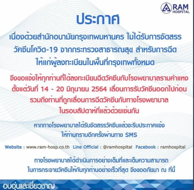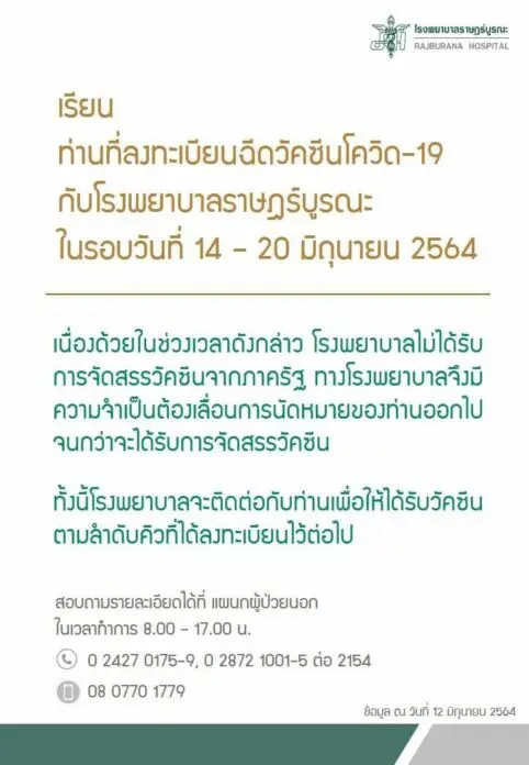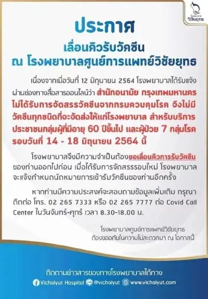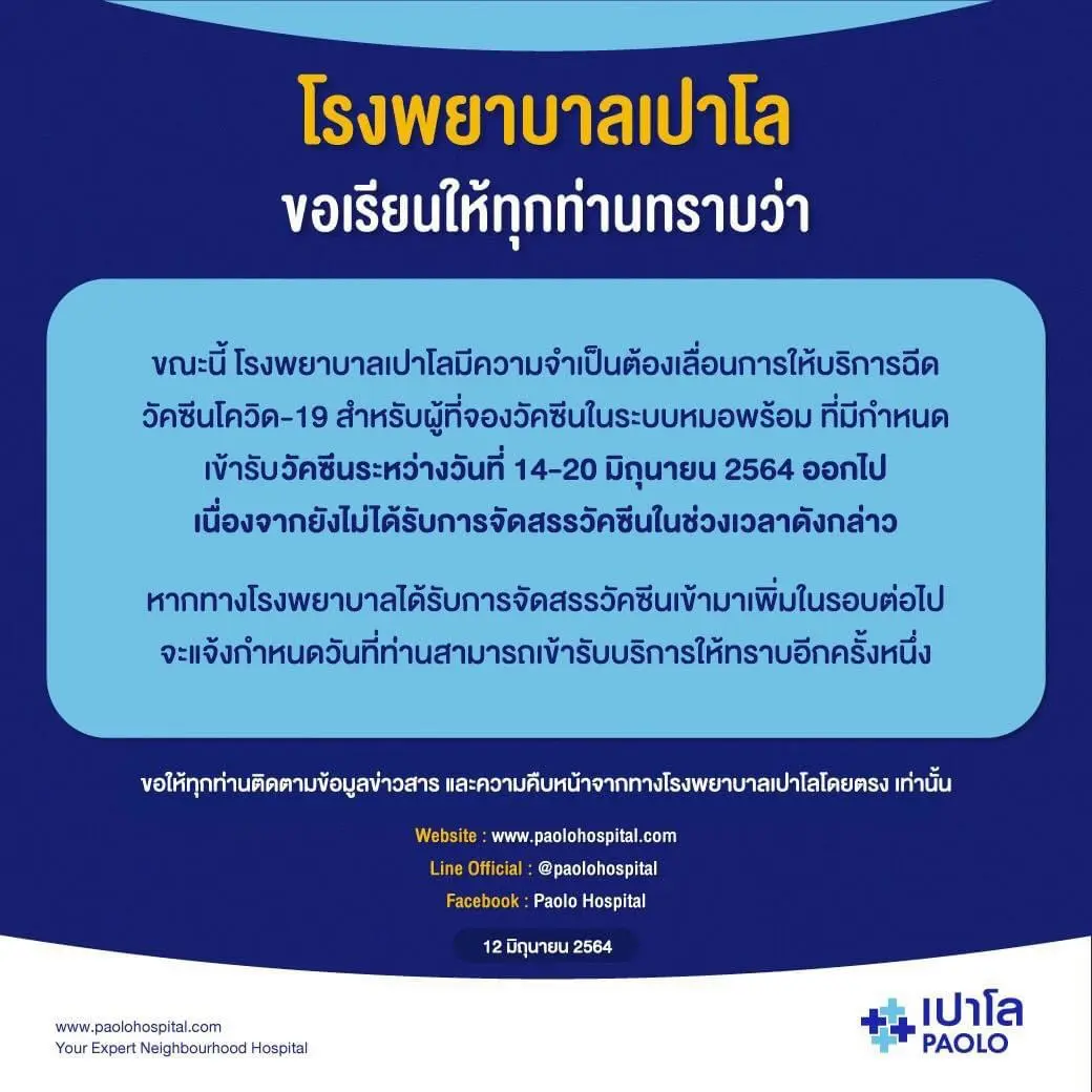 รพ.เขตกรุงเทพฯรวมให้แล้ว รพ.เขตกรุงเทพฯ ประกาศเลื่อนฉีดวัคซีน ตั่งแต่วันที่ 14 มิถุนายน 64 พร้อมให้เหตผลยังไม่ได้รับการจัดสรรวัคซีน