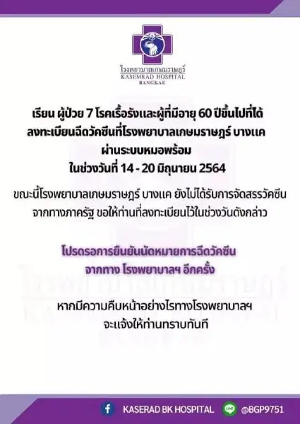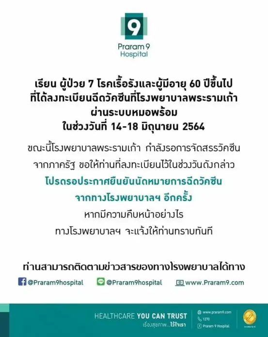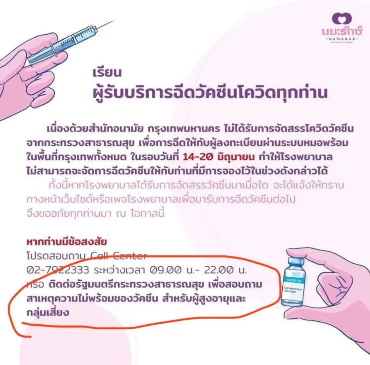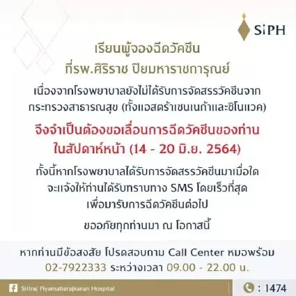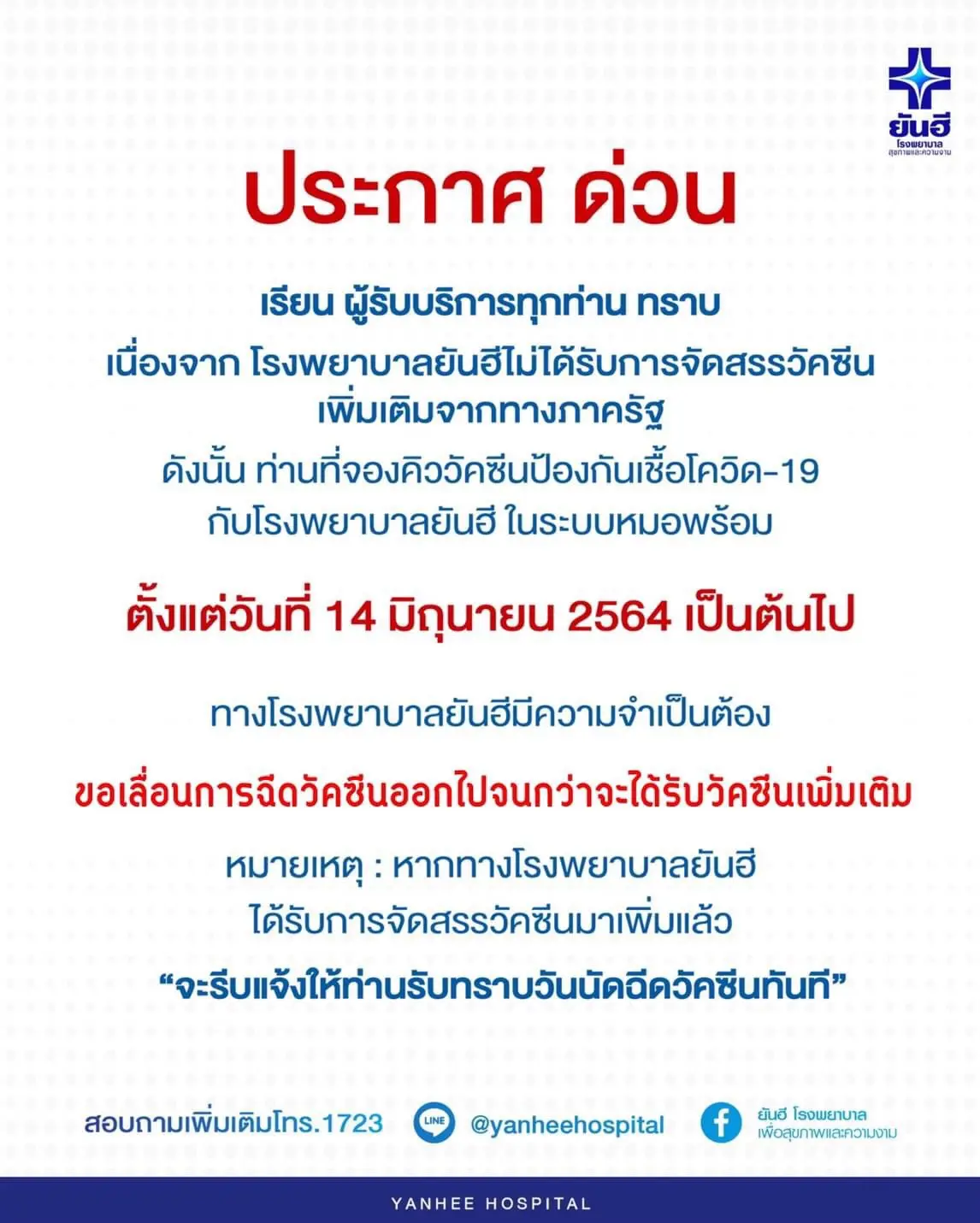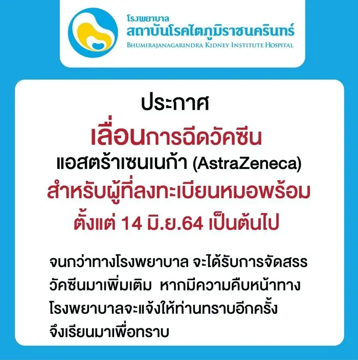 รพ.เขตกรุงเทพฯรวมให้แล้ว รพ.เขตกรุงเทพฯ ประกาศเลื่อนฉีดวัคซีน ตั่งแต่วันที่ 14 มิถุนายน 64 พร้อมให้เหตผลยังไม่ได้รับการจัดสรรวัคซีน