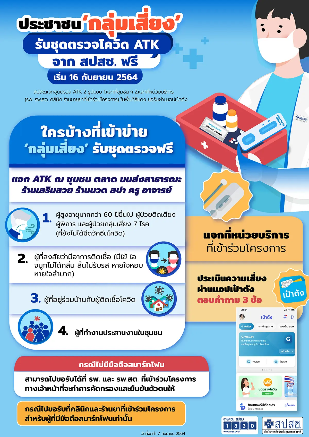 สปสช. แจกชุดตรวจ ATK สำหรับกลุ่มเสี่ยง ผ่านแอป ‘เป๋าตัง’ แล้ววันนี้ (16 ก.ย.) ลงทะเบียนพร้อม เช็ครายชื่อหน่วยบริการที่นี่