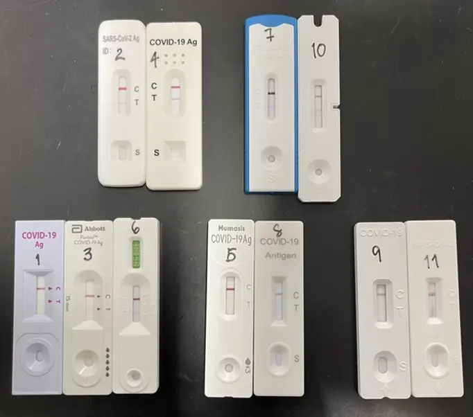 1.ชุดตรวจ 9 ใน 11 ยี่ห้อที่นำมาทดสอบสามารถตรวจวัดโอมิครอนได้ มีแถบขึ้นที่ T ที่เห็นได้ด้วยตาเปล่า อีก 2 ยี่ห้อไม่สามารถมองเห็นได้ แต่ยังไม่สามารถสรุปได้ว่าไม่มีความจำเพาะต่อโอมิครอน หรือ ระดับการตรวจวัดยังไม่ไวเท่าชุดตรวจอื่นๆ แสดงว่า ชุดตรวจส่วนใหญ่สามารถมีความจำเพาะต่อโอมิครอนได้ กรณีที่มีปริมาณไวรัสเพียงพอ ทุกยี่ห้อที่ได้ผลบวกมาน่าจะตรวจวัดได้ทั้งหมด