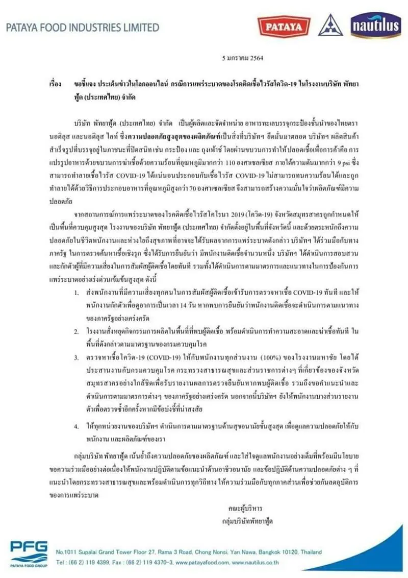 ล่าสุด บริษัทพัทยา ฟู้ด (ประเทศไทย) จำกัดได้ออกแถลงการณ์ชี้แจงในกรณีดังกล่าว โดยระบุว่า จากสถานการณ์การแพร่ระบาดของเชื้อไวรัสโควิด-19 ในจังหวัดสมุทรสาครถูกกำหนดให้เป็นพื้นที่ควบคุมสูงสุด ซึ่งโรงงานของบริษัทตั้งอยู่ในพื้นที่จังหวัดนี้ บริษัทจึงได้ร่วมมือกับภาครัฐในการตรวจค้นหาเชื้อเชิงรุก ซึ่งได้รับการยืนยันว่ามีพนักงานจำนวนหนึ่งติดเชื้อไวรัสโควิด-19 จึงได้สอบสวนและกักตัวผู้ที่มีความเสี่ยงสัมผัสผู้ติดเชื้อทันที รวมถึงดำเนินการตามมาตรการและแนวทางในการป้องกันการแพร่ระบาดอย่างเร่งด่วนเข้มข้นสูงสุด ดังนี้