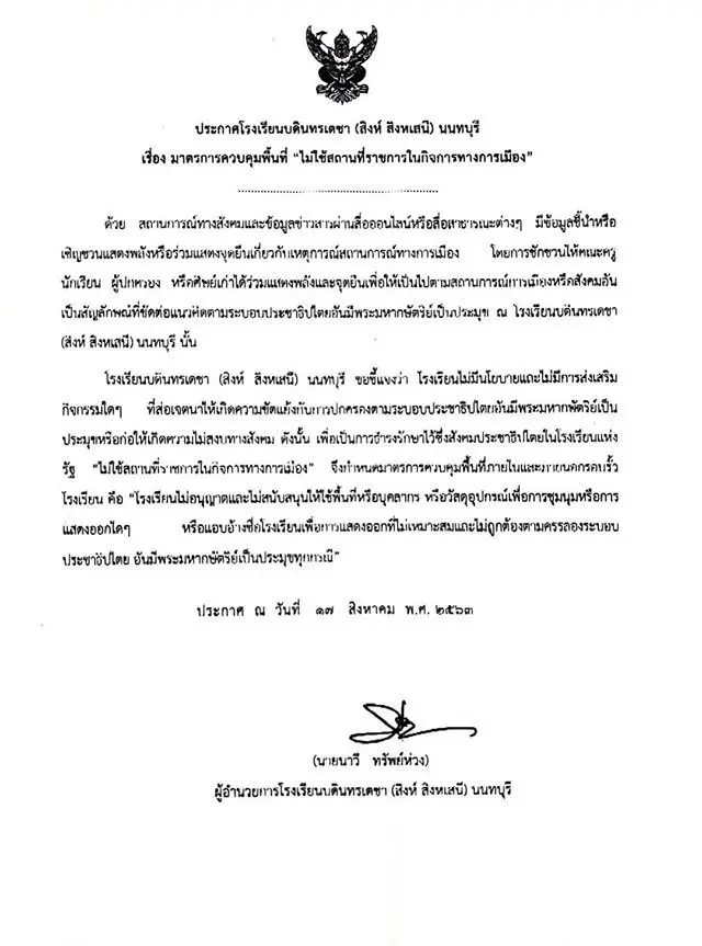โรงเรียนดังในนนทบุรี — โรงเรียนบดินทรเดชา-สิงห์ สิงหเสนี-นนทบุรี ได้ออกประกาศเรื่อง มาตรการควบคุมพื้นที่ “ไม่ใช้สถานที่ราชการในกิจการทางการเมือง” หลังจากที่นักเรียนทั่วประเทศได้นัดกันทำกิจกรรมแสดงออกทางสิทธิและเสรีภาพ ด้วยการชู 3 นิ้ว และผูกโบว์ขาว