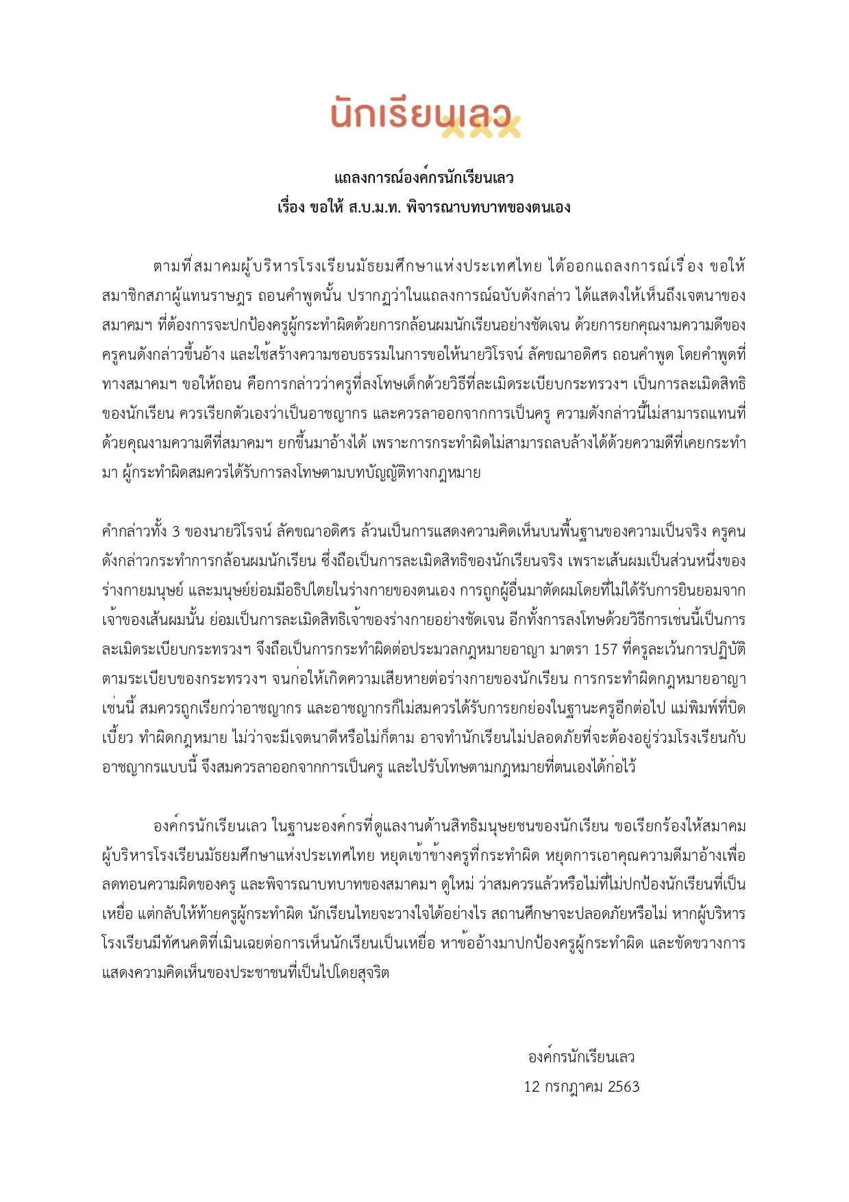 นักเรียนเลว แถลงการณ์ตอบโต้ สมาคมผู้บริหารร.ร.มัธยมฯ ชี้ วิโรจน์แสดงความคิดเห็นบนพื้นฐานความจริง สมาคมฯ ควรทบทวนบทบาทตัวเองใหม่ อย่าเข้าข้างคนผิด