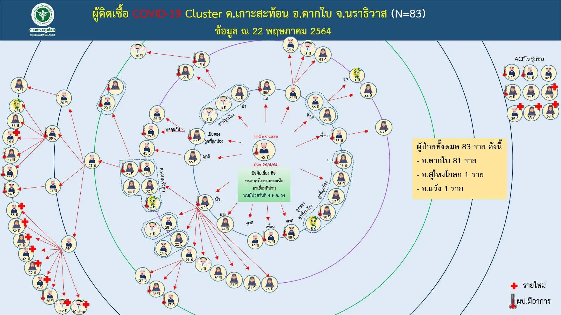 เมื่อวันที่ 23 พ.ค. นพ.ทวีศิลป์ วิษณุโยธิน โฆษก ศูนย์บริหารสถานการณ์แพร่ระบาดของโรคติดเชื้อไวรัสโคโรนา 2019 หรือ ศบค. ได้เปิดเผยถึงกรณีการติดเชื้อโควิด19 จาก คลัสเตอร์ตากใบ ในจังหวัดนราธิวาส พบว่าจากการตรวจหาเชื้อในวันที่ 22 พ.ค. มีการรายงานพบผู้ติดเชื้อเพิ่ม 12 ราย ที่มีความเชื่อมโยงจากเคสแรกที่พบในชายไทยอายุ 32 ปีที่ได้รับการยืนยันไปเมื่อวันที่ 4 พ.ค. ที่ผ่านมา