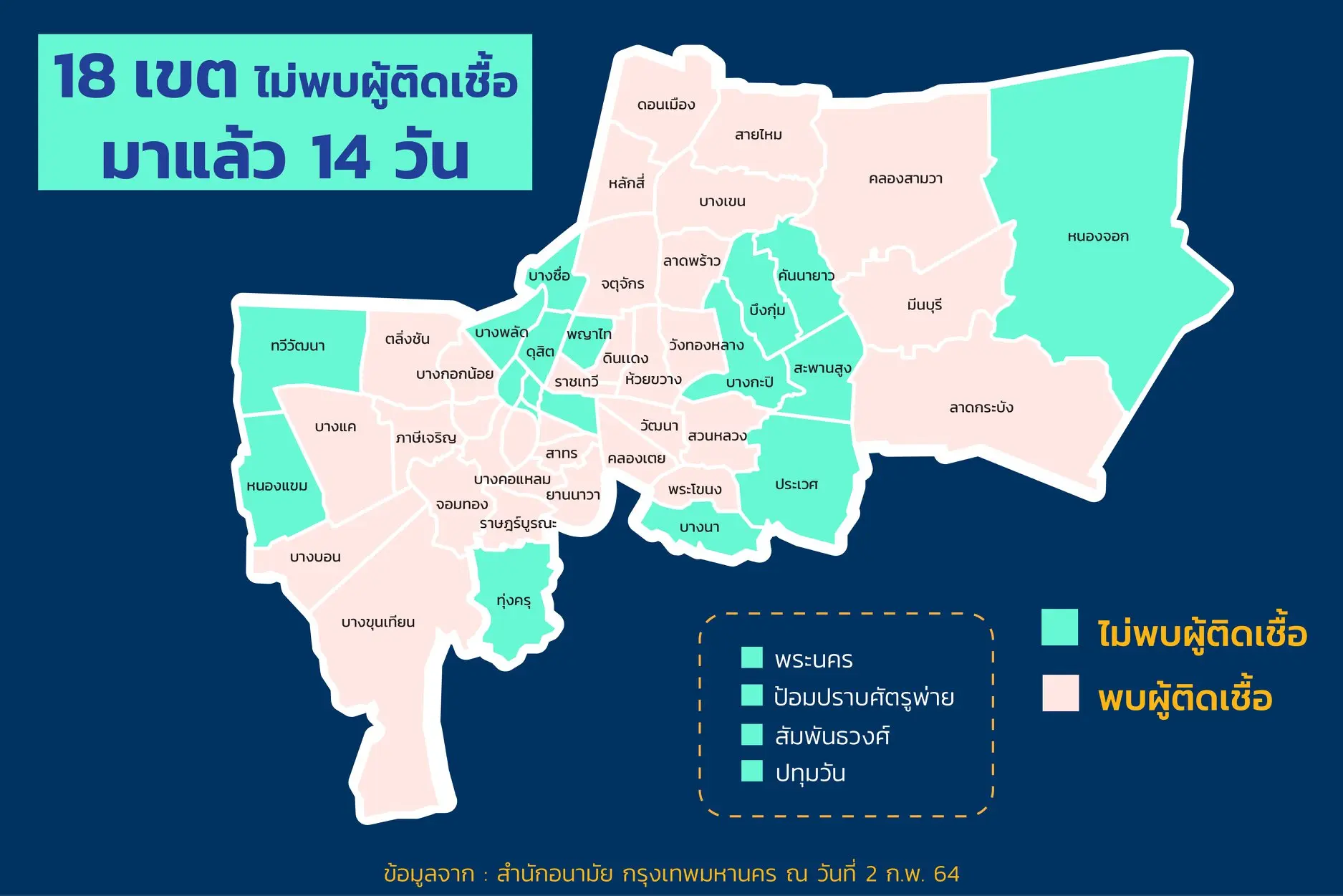 โดย 18 เขตที่ไม่พบผู้ติดเชื้อ ประกอบด้วย เขตทวีวัฒนา , เขตหนองแขม , เขตทุ่งครุ , เขตบางพลัด , เขตบางซื่อ , เขตพญาไท , เขตดุสิต , เขตพระนคร , เขตป้อมปราบศัตรูพ่าย , เขตสัมพันธวงศ์ , เขตปทุมวัน , เขตบางนา , เขตประเวศ , เขตบางกะปิ , เขตสะพานสูง , เขตบึงกุ่ม , เขตคันนายาว และเขตหนองจอก