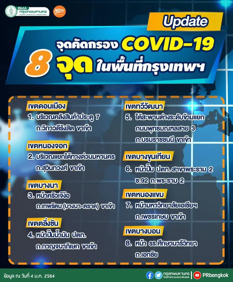 สำนักงานประชาสัมพันธ์ กรุงเทพมหานครประกาศอัพเดทผ่านทางเฟสบุ๊ก จุดคัดกรองโควิด ผู้ที่จะเดินทางเข้ามาในพื้นที่กรุงเทพฯ 8 จุด ลดลงจาก 14 จุดเดิม เพื่อความสะดวกของประชาชน ตามมติที่ประชุม ศบค.กทม.