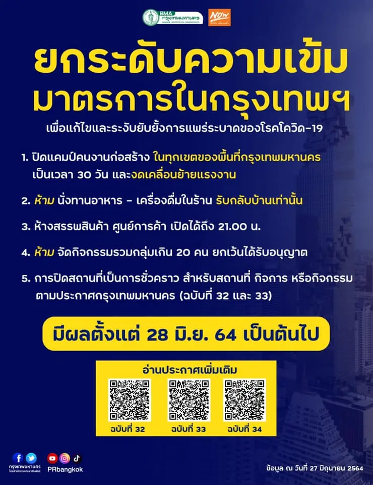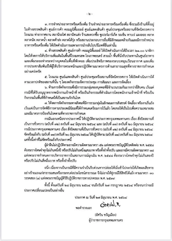 1.ให้ปิดสถานที่และใช้บังคับมาตรการที่ระบุไว้ในประกาศกรุงเทพมหานคร เรื่อง สั่งปิดสถานที่เป็นการชั่วคราว (ฉบับที่ 32) ลงวันที่ 14 มิถุนายน 2564 และ (ฉบับที่ 33) ลงวันที่ 20 มิถุนายน 2564