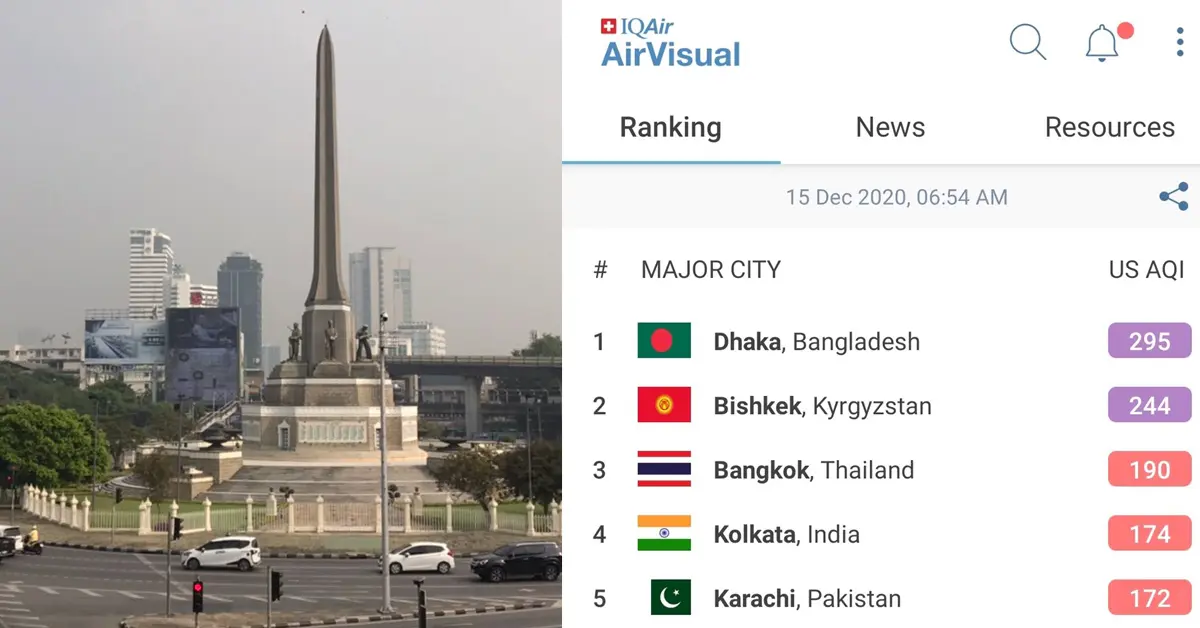 โดยเว็บไซต์ airvisual.com เผยการจัดอันดับคุณภาพอากาศและการจัดอันดับเมืองที่มีมลพิษ ตามมาตรฐาน US AQI เมื่อช่วงเวลา 08.00 น. (วันนี้ 15 ธ.ค.63) พบว่า กทม. (ประเทศไทย) อยู่อันดับ3 (ขยับจากอันดับ5 วานนี้)