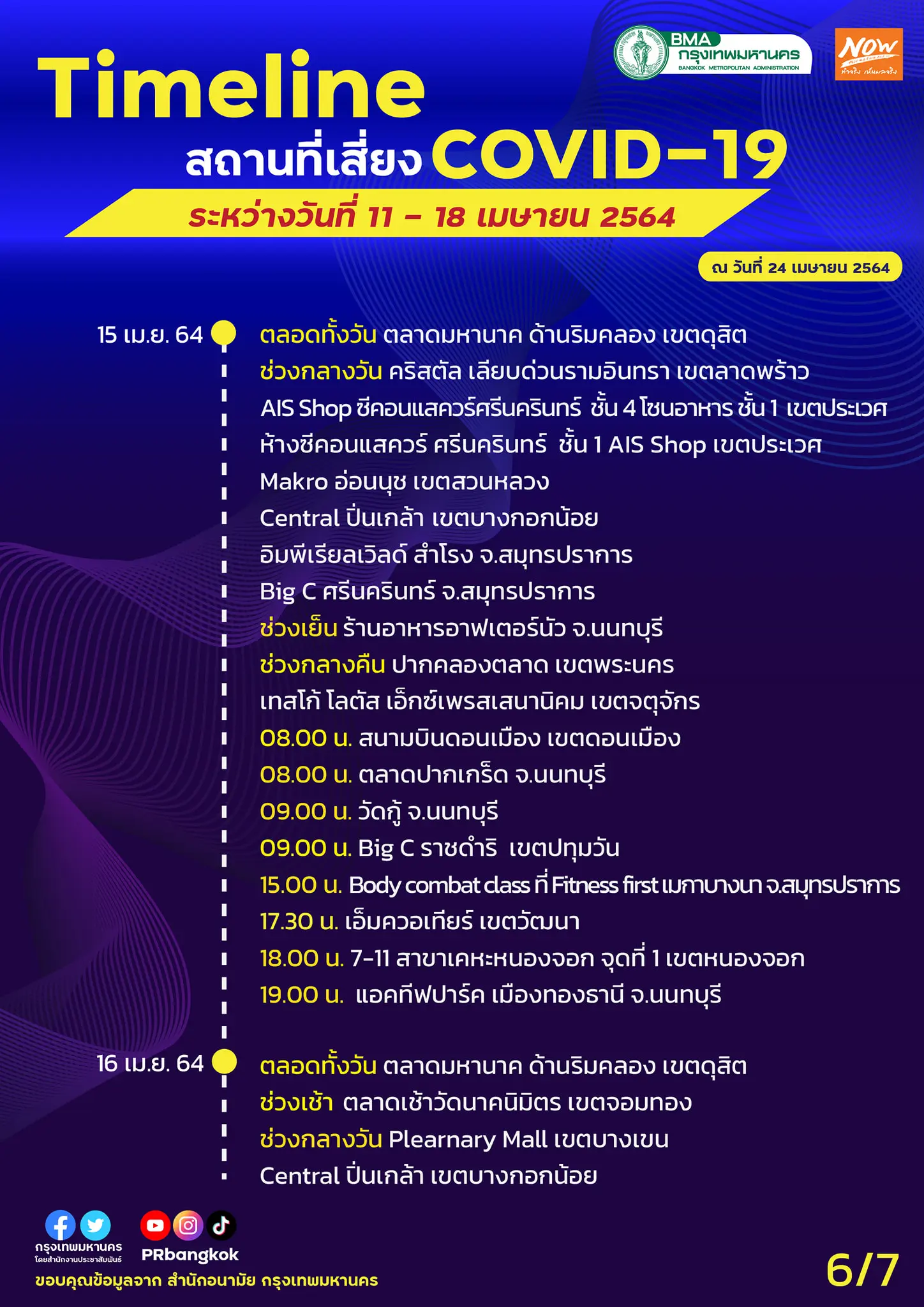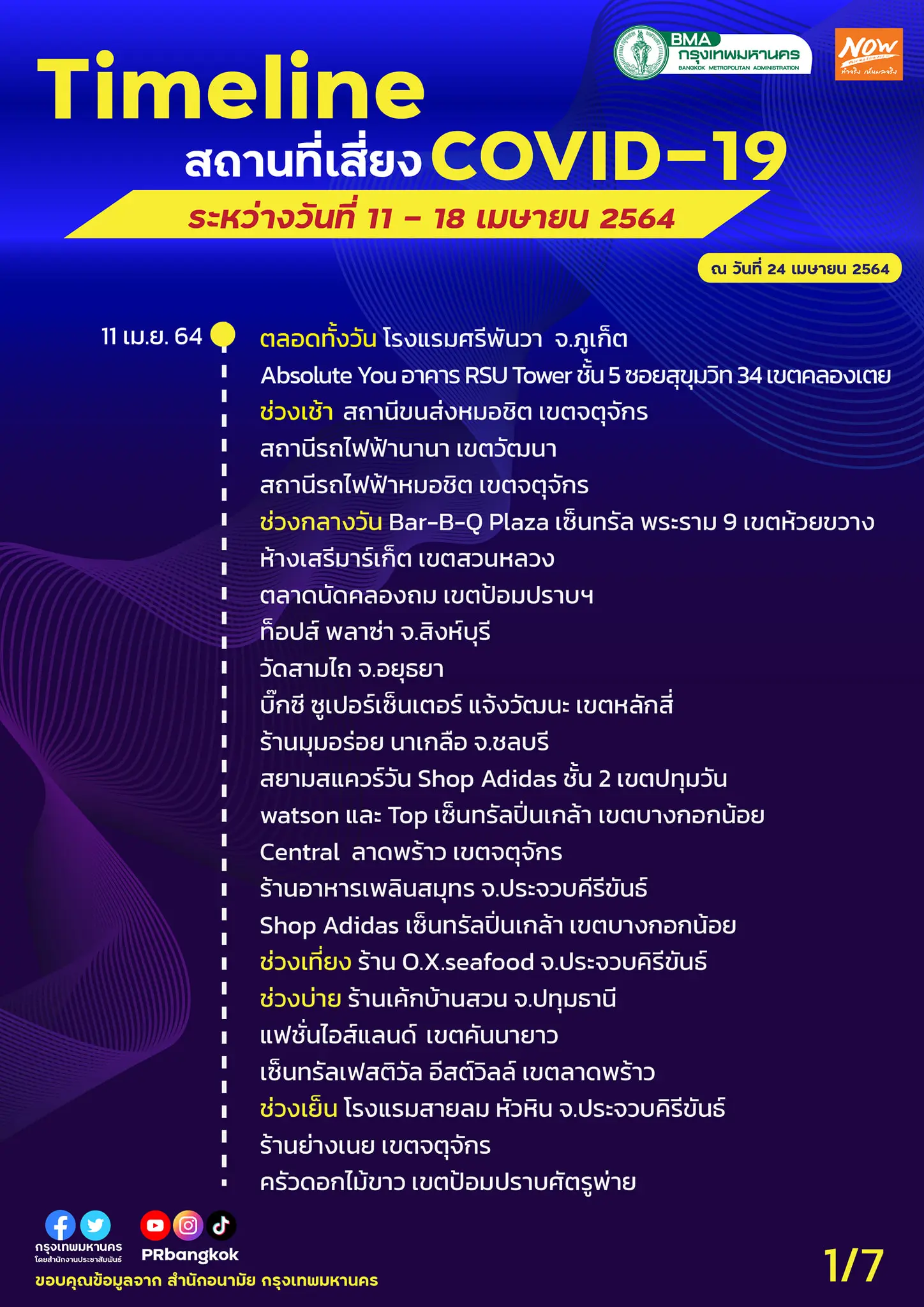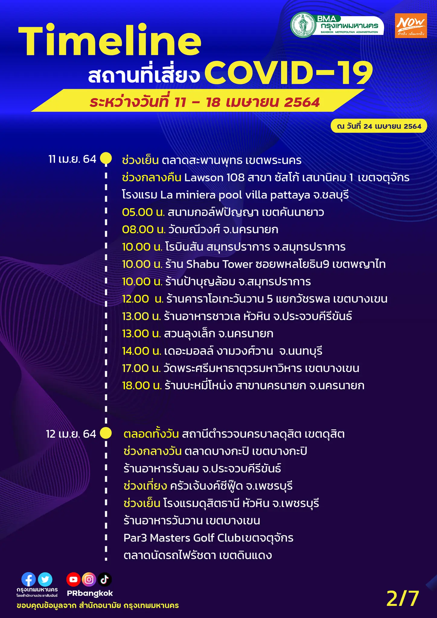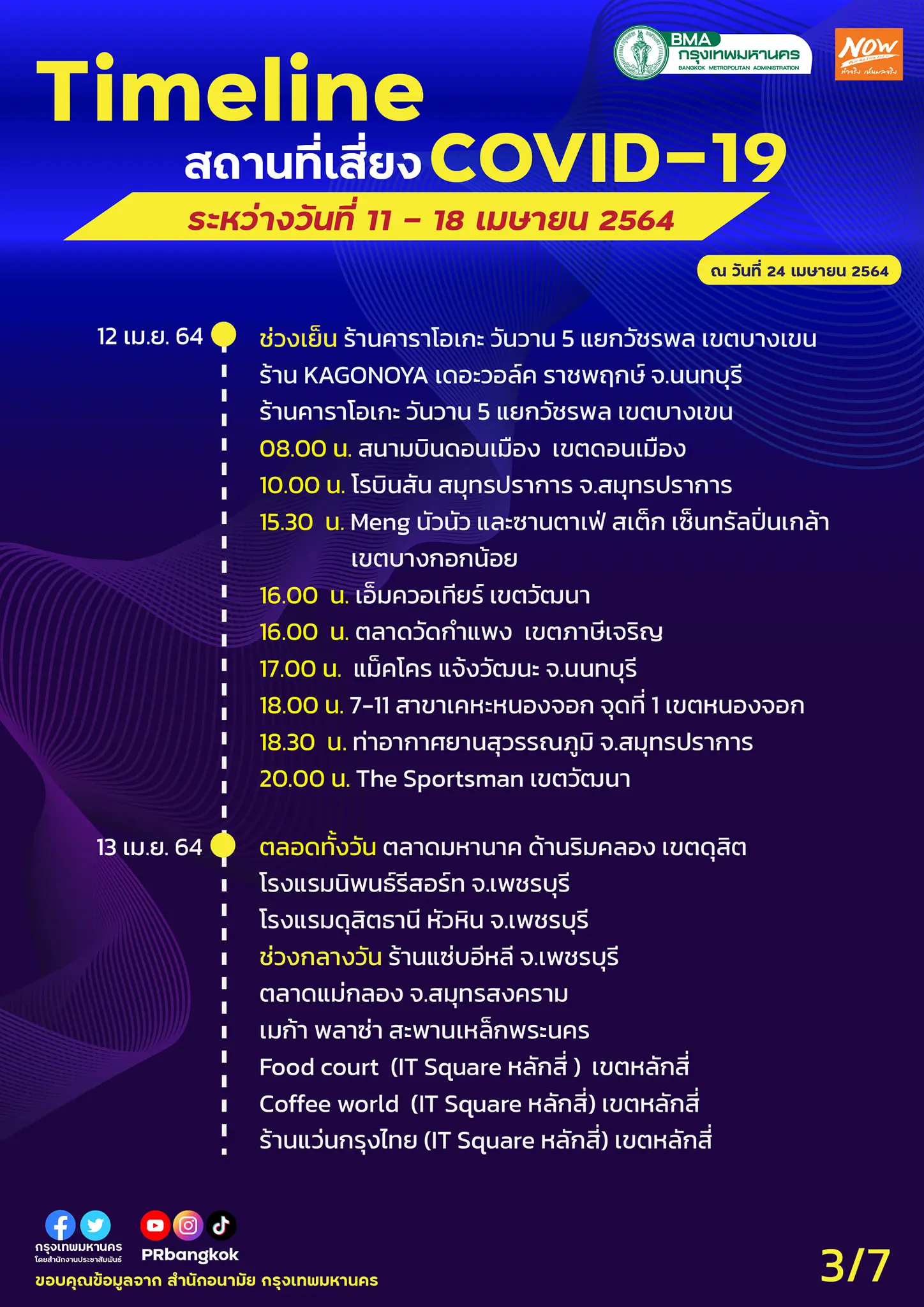 สถานที่เสี่ยง —เมื่อวันที่ 25 เม.ย 64 เฟสบุ๊กเพจ กรุงเทพมหานคร โดยสำนักงานประชาสัมพันธ์ได้โพสต์ข้อความระบุว่า วันนี้ มีอัปเดต Timeline เพิ่มเติม สถานที่เสี่ยง COVID-19 ระหว่างวันที่ 11-18 เมษายน 2564 (ข้อมูล ณ วันที่ 24 เมษายน 2564 ) มีรายละเอียดตามรูปด้านล่าง