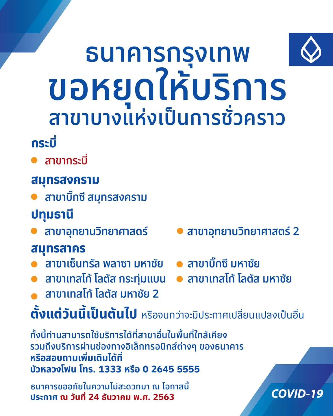 1.ปิดให้บริการชั่วคราว ธนาคารกรุงเทพ สาขากระบี่ เป็นเวลา 3 วัน ตั้งแต่วันที่ 24 ธันวาคม 2563 เพื่อทำความสะอาดและฉีดพ่นยาฆ่าเชื้อ ตามประกาศคณะกรรมการโรคติดต่อ จังหวัดกระบี่