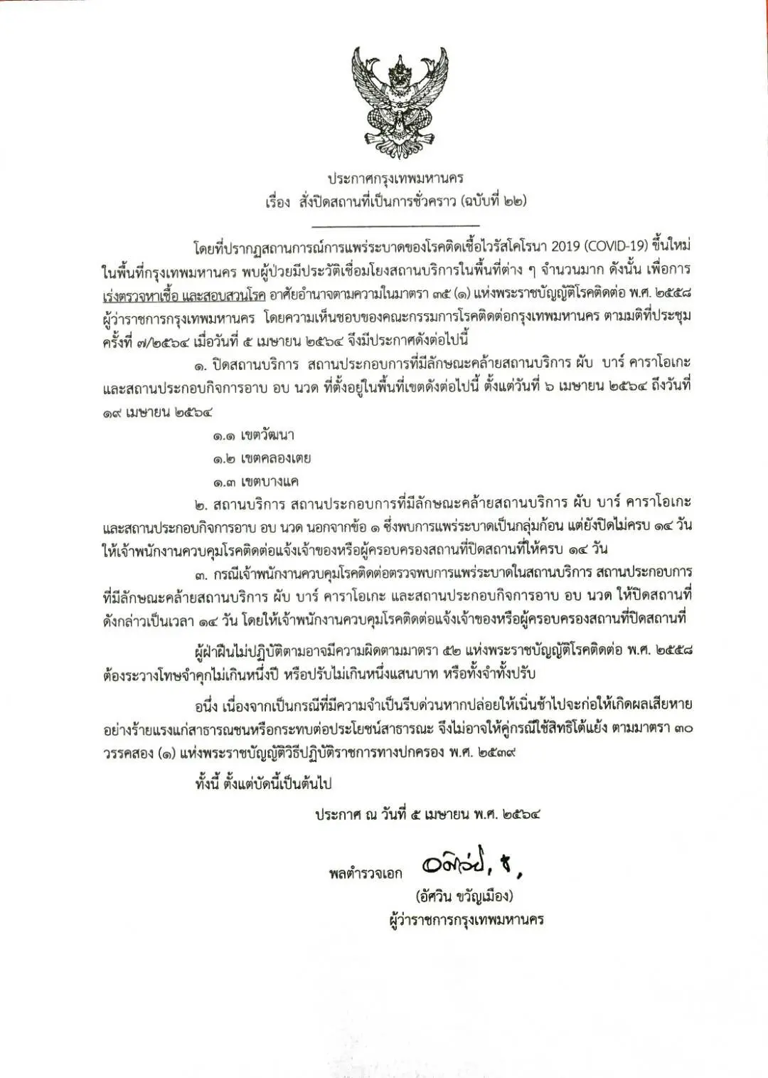 ล่าสุด เมื่อวันที่ 5 เม.ย.เวลา 20.30 น.ที่ศาลาว่าการ พล.ต.อ.อัศวิน ขวัญเมือง ผู้ว่าราชการกรุงเทพมหานคร(กทม.) แถลงผลการประชุมคณะกรรมการโรคติดต่อกรุงเทพมหานคร ถึงแนวทางควบคุมการแพร่ระบาดของโรคติดเชื้อไวรัสโคโรนา 2019 (โควิด-19) ว่าคณะกรรมการฯจึงมีความเห็นให้สถานบันเทิงใดๆ ที่มีการแพร่ระบาด เช่น สถานบันเทิงในเขตวัฒนา 81 แห่ง สถานบันเทิงในเขตคลองเตย อีก 75 แห่ง และสถานบันเทิงในเขตบางแค 40 แห่ง รวมทั้งหมด 196 แห่ง ดังนั้นคณะกรรมการฯ มีมติให้ปิดสถานบันเทิงใน 3 เขต ประกอบด้วย เขตคลองเตย เขตวัฒนา และเขตบางแค เริ่มมีผลตั้งแต่วันที่ 6-19 เม.ย.นี้