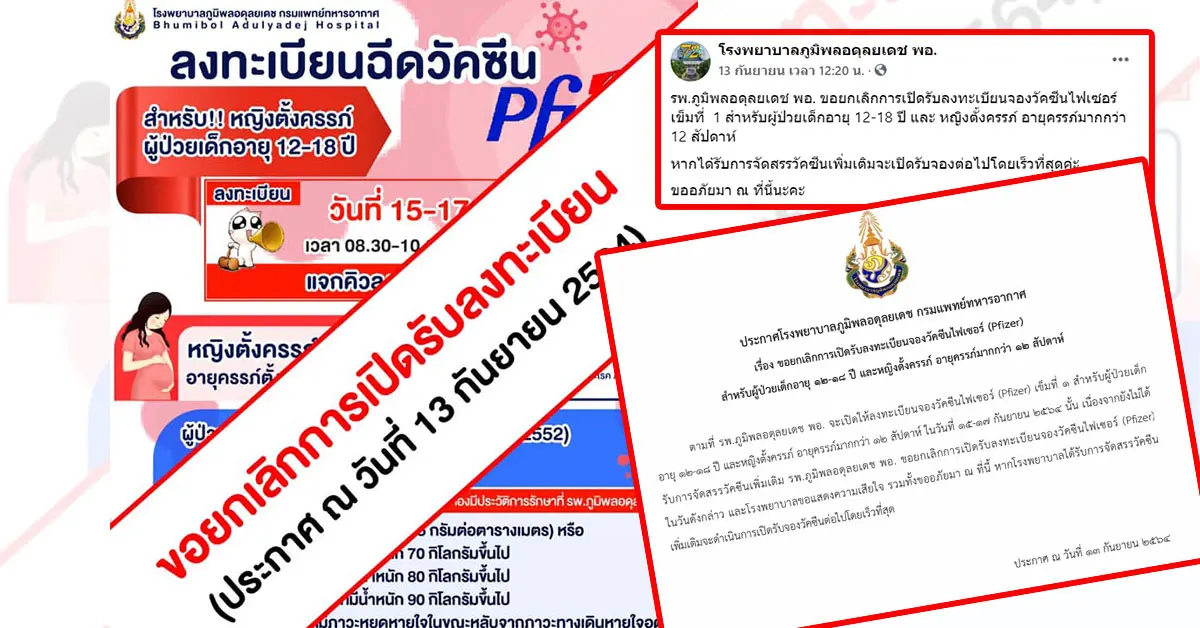ต่อมาในวันที่ 13 กันยายน 2564 ทางเพจเฟซบุ๊ก โรงพยาบาลภูมิพลอดุลยเดช พอ. โพสต์ประกาศขอยกเลิกการเปิดรับลงทะเบียนจองวัคซีนไฟเซอร์ เข็มที่ 1 สำหรับผู้ป่วยเด็กอายุ 12-18 ปี และ หญิงตั้งครรภ์ อายุครรภ์มากกว่า 12 สัปดาห์หากได้รับการจัดสรรวัคซีนเพิ่มเติมจะเปิดรับจองต่อไปโดยเร็วที่สุดค่ะ ขออภัยมา ณ ที่นี้