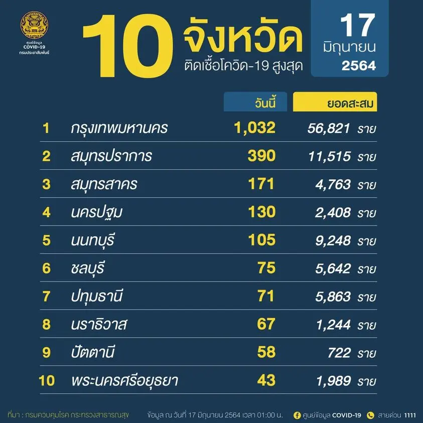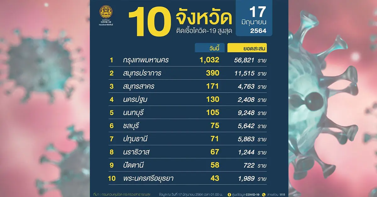 ข้อมูลล่าสุดวันนี้ (17 มิถุนายน 2564 ) ศบค.ประกาศ 10 จังหวัดที่ยอดผู้ติดเชื้อรายใหม่สุดสุดในประเทศ แน่นอนครองที่1มาหลายเดือนคือ กทม. มีผู้ติดเชื่อรายใหม่สูงถึง 1032 ราย ตามมาด้วย สมุทรปราการ สมุทรสาคร นครปฐม นนทบุรี ชลบุรี ปทุมธานี นราธิวาส ปัตตานี อยุธยา