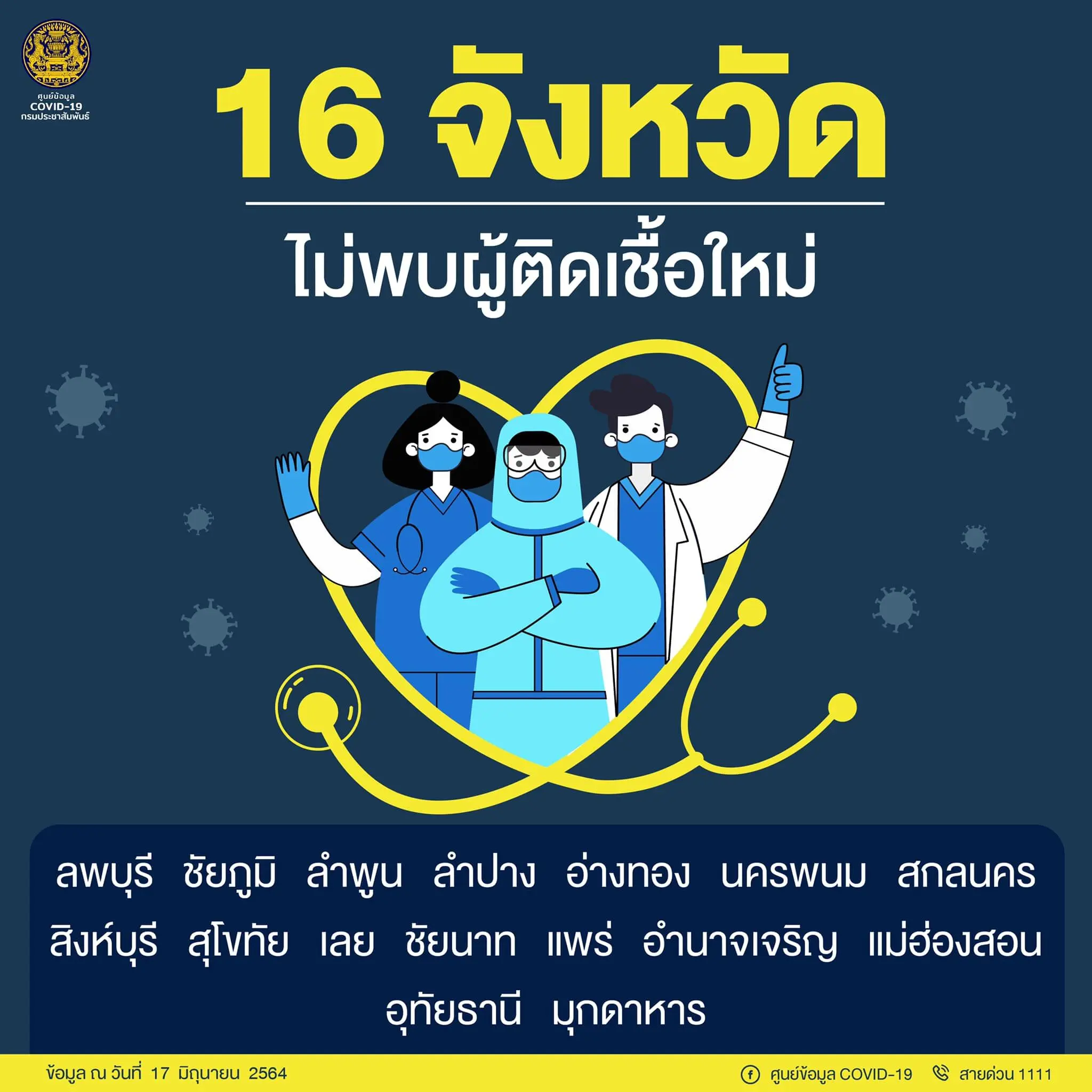 ศบค.รายงานสถานการณ์การแพร่ระบาดของเชื้อโควิด-19 ในวันที่ 17 มิถุนายน 2564 โดยแพทย์หญิงอภิสมัย ศรีรังสรรค์ ผู้ช่วยโฆษกศูนย์บริหารโควิด-19 (ศบค.) พบผู้ติดเชื้อรายใหม่ 2,672 ราย เสียชีวิต 30 ราย ทำให้การระบาดโควิด19 ระลอกใหม่ตั้งแต่เดือนเมษายน 2564 มียอดผู้เสียชีวิตรวม 1,461 ราย สำหรับวันนี้มีรายงานผู้ติดเชื้อจากเรือนจำทั้งหมด 457 ราย รวมจำนวนผู้ติดเชื้อรายใหม่วันนี้ทั้งสิ้น 3,129 ราย