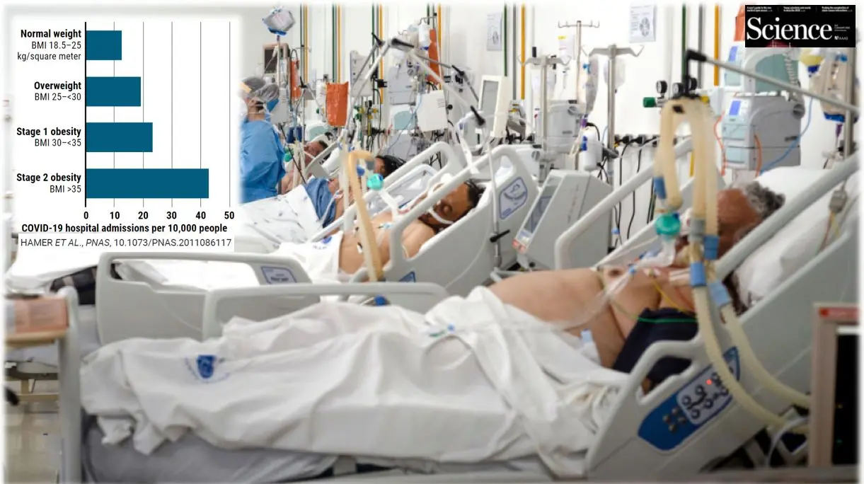 ในกราฟเป็นรูปจากการศึกษาวารสาร PNAS ผู้ป่วยในประเทศอังกฤษที่พบว่าอัตราการนอนโรงพยาบาลในผู้ที่ติดเชื้อโควิดสูงขึ้นตามดัชนีมวลกาย ถ้าดัชนีมวลกายมากกว่า 35 อัตราการนอนโรงพยาบาลสูงกว่าคนปกติเกือบสองเท่า