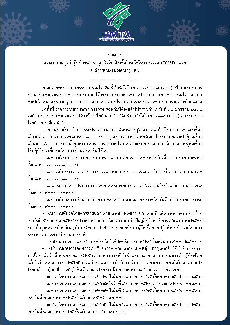 องค์การขนส่งมวลชนกรุงเทพ (ขสมก.) แจ้งว่ามีพนักงานเป็นผู้ติดเชื้อไวรัสโคโรนา 2019 (COVID) จำนวน 4 คน