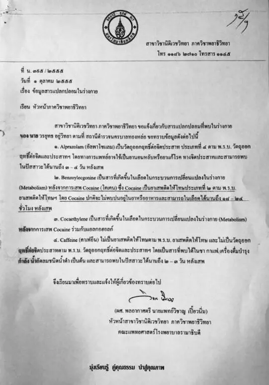 เอกสารทางการแพทย์ รพ.รามาฯ ยืนยันในร่างกาย บอส อยู่วิทยา พบสารออกฤทธิ์ต่อจิตประสาท ประเภท 4 และสารที่เกิดขึ้นหลังการเสพ โคเคน