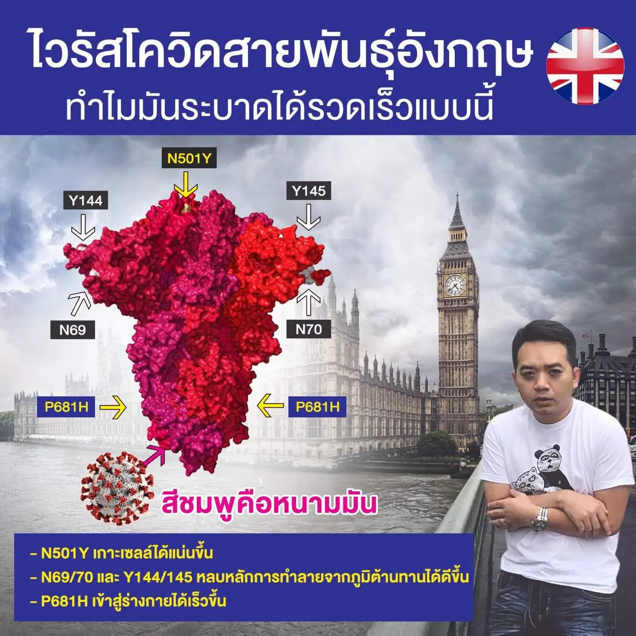 ในส่วนของการกลายพันธุ์ ทนพ.ภาคภูมิ เดชหัสดิน หรือ หมอแล็บแพนด้า ได้โพสต์อธิบายเหตุผลของการแพร่ระบาดของเชื้อไวรัสโควิด-19 สายพันธุ์อังกฤษที่แพร่ระบาดได้รวดเร็วกว่า สายพันธุ์เดิม ผ่านเฟซบุ๊กเพจ โดยระบุข้อความว่า