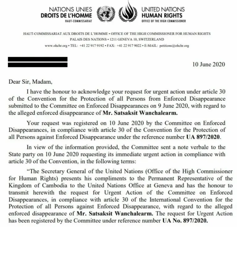 คำตอบของรัฐบาลกัมพูชานี้เกิดขึ้นหลังจากคณะกรรมการตามอนุสัญญาระหว่างประเทศว่าด้วยการคุ้มครองมิให้บังคับบุคคลสูญหาย หรือ CED แจ้งว่าได้รับการร้องเรียนว่าได้มีการบังคับสูญหายนายวันเฉลิม สัตย์ศักดิ์สิทธิ์ ผู้ลี้ภัยจากประเทศไทย หายตัวไปขณะอยู่ที่ประเทศกัมพูชา และทางคณะกรรมการฯ ได้ส่งหนังสือด่วนถึงเอกอัครราชทูตและผู้แทนถาวรกัมพูชา ประจำสำนักงานสหประชาชาติ ณ นครเจนีวา ขอให้กัมพูชาซึ่งเป็นประเทศที่ได้ให้สัตยาบันอนุสัญญาคุ้มครองมิให้บังคับบุคคลสูญหาย ทำการสืบสวนสอบสวนอย่างเร่งด่วน ต่อชะตากรรมของวันเฉลิม และรายงานโดยตรงต่อคณะกรรมการฯ ภายวันที่ 24 มิ.ย. 2563 รัฐบาลกัมพูชาจึงมีหนังสือตอบกลับมายังคณะกรรมการฯ เมื่อวันที่ 19 มิ.ย. 2563