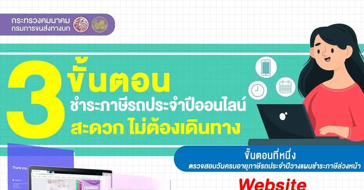 เมื่อวันที่ 20 มกราคม 2565 ทางด้านของเพขเฟศบุ๊ก ไทยคู่ฟ้า เผยขึ้นตอนการชำระภาษีรถประจำปี ทางออนไลน์ โดยที่เจ้าของรถไม่ต้องเดินทางไปยังขนส่งใกล้บ้าน เพราะสามารถดำเนินการชำระผ่านทางช่องทางออกไลน์ สำหรับประชาชนท่านใดที่มีรถยนต์อายุการใช้งานไม่เกิน 7 ปี หรือรถจักรยานยนต์มีอายุการใช้งานไม่เกิน 5 ปี สามารถชำระภาษีรถประจำปีผ่านระบบออนไลน์ได้ทันที