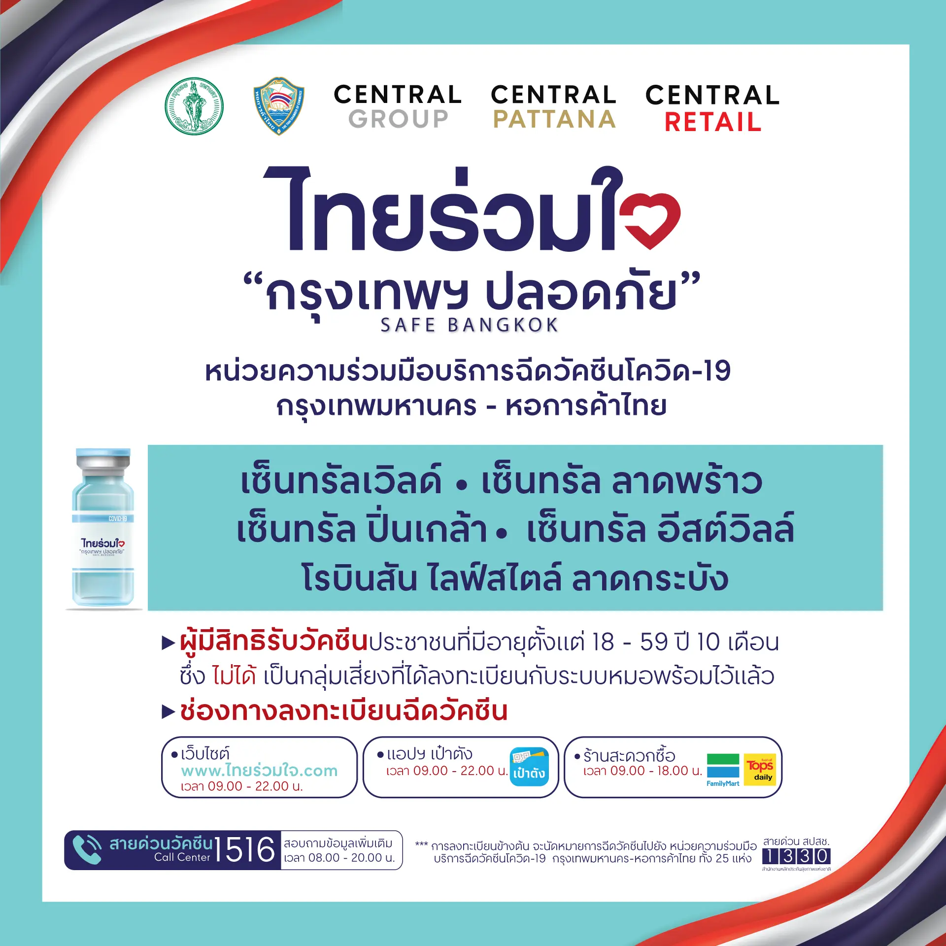 ล่าสุดเพจเฟซบุ็ก CentralWorld ได้เผยรายชื่อสาขาที่เข้าร่วมเป็นหน่วยบริการฉีดวัคซีน ทั้งหมด 4 สาขา คือ