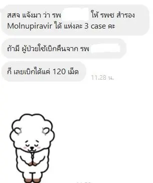 ขณะที่ โรงพยาบาลชุมชนในจังหวัดหนึ่งก็ได้จัดสรรโมลนูพิราเวียมาแก้ขัดช่วงฟาวิขาดแคลน ได้จัดสรรมาก่อนแห่งละ 120 เม็ด (ใช้ได้กับผู้ป่วย 3 คนเอง)