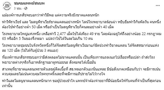 เฟซบุ๊กชมรมแพทย์ชนบท จวกเละ สธ. หลอกตัวเลขผู้ป่วยโควิด-19 ส่งผลให้หลายโรงพยาบาล ขาดแคลนยารักษาโควิดอย่างมาก