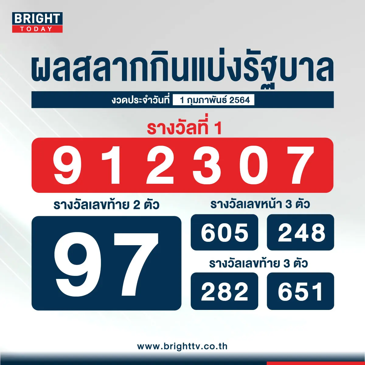 ตรวจหวย สลากกินแบ่งรัฐบาล 1 กุมภาพันธ์ 2564 รางวัลที่ 1 คือ – รางวัลเลขท้าย 2 ตัว คือ 97 – รางวัลเลขท้าย 3 ตัว คือ 282 – 651