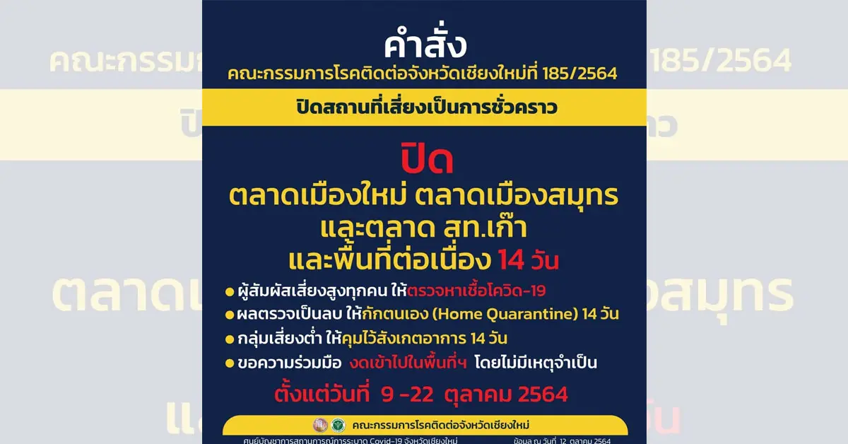 ทั้งนี้ยอดผู้ติดเชื้อจากพื้นที่ดังกล่าวยังพุ่งสูงต่อเนื่องเรื่อยๆ และได้มีคำสั่งให้ปิดพื้นที่ตลาดเมืองใหม่และตลาด ส.ท.เก๊า เป็นเวลา 14 วัน ตั้งแต่วันที่ 9 – 22 ตุลาคม ทางด้านของหน่วยงานที่เกี่ยวข้อง อาทิ เจ้าหน้าที่เทศกิจเทศบาลนครเชียงใหม่และเจ้าหน้าที่หน่วยปฏิบัติการพิเศษ ตำรวจภธูร จ.เชียงใหม่ ได้ลงพื้นที่ตั้งด่านตรวจทั้งหมด 4 ด่าน ควบคุมการเข้าออก โดยไม่มีความจำเป็นและควบคุมไม่ให้มีการซื้อขายสินค้า เป็นแนวทางการป้องกันเชื้อโควิด-19