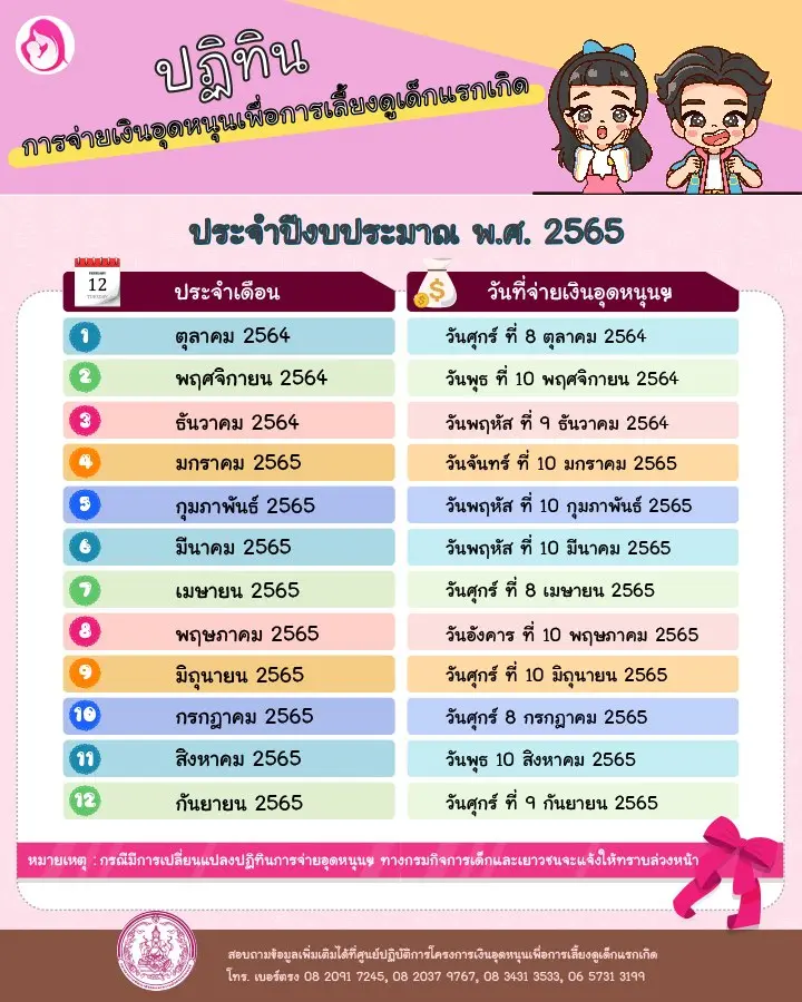 หรือสามารถติดต่อสอบถามข้อมูลเพิ่มเติมได้ที่ศูนย์ปฏิบัติการโครงการเงินอุดหนุนเพื่อการเลี้ยงดูเด็กแรกเกิด