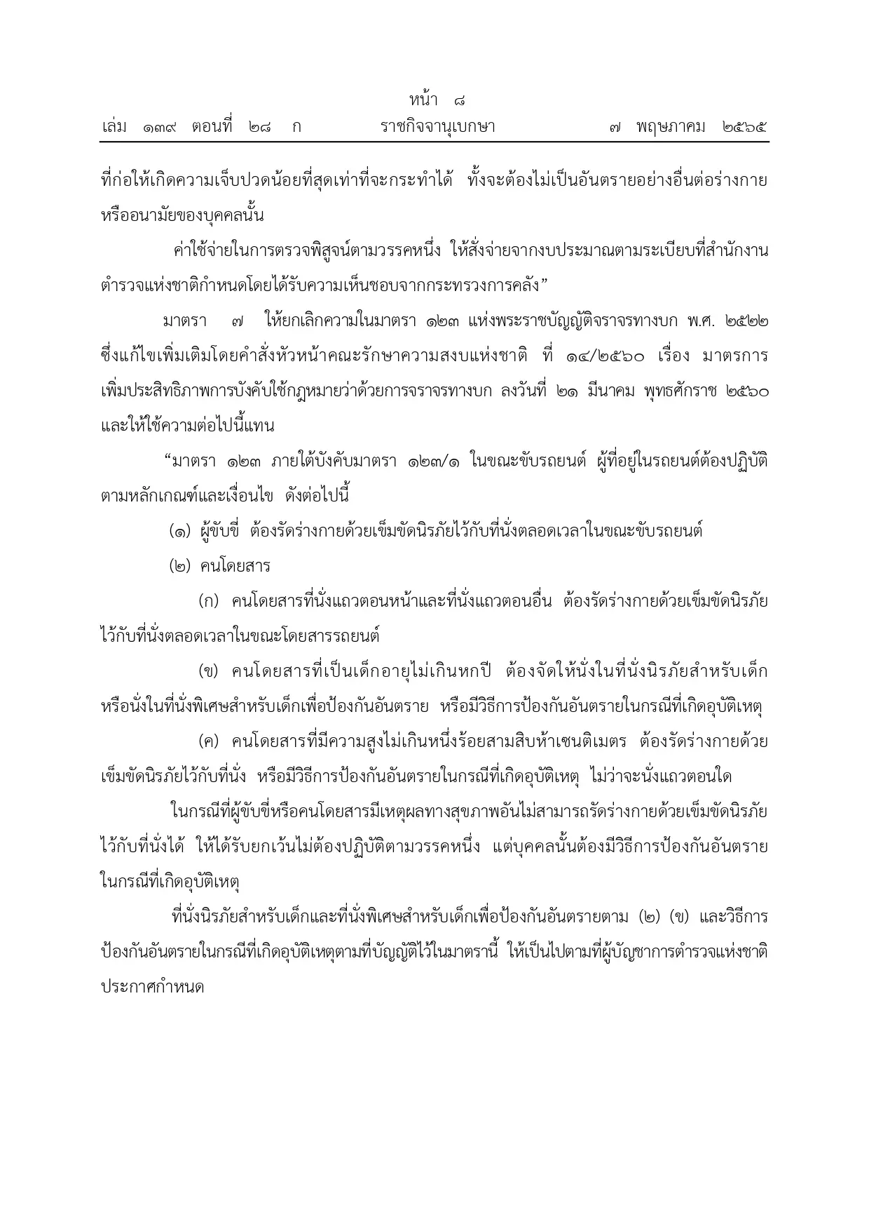 เว็บไซต์ ราชกิจจานุเบกษา เผยแพร่ พ.ร.บ.จราจรทางบก ระบุว่า เด็กอายุไม่เกิน 6 ปี ต้องนั่ง Car seat หากฝ่าฝืนโทษปรับ 2 พันบาท