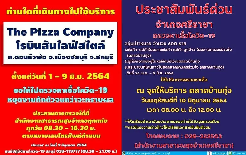 - คลัสเตอร์ The Pizza Company โรบินสัน ไลฟ์สไตล์ อ.เมืองชลบุรี – พบผู้ป่วย 7 ราย
