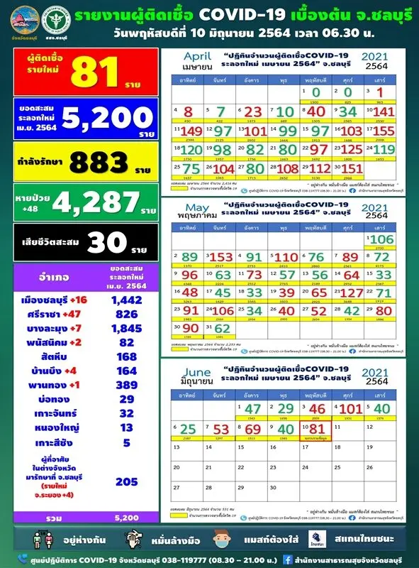 รายงานสถานการณ์ยอดผู้ติดเชื้อโควิด-19 ของจังหวัดชลบุรี ในวันที่ 10 มิถุนายน 2564 โดย สำนักงานสาธารณสุขจังหวัด (สสจ.) ชลบุรี พบผูิติดเชื้อรายใหม่ 81 ราย มียอดสะสม 5,200 ราย กำลังรักษาตัวอยู่อีก 883 ราย หายป่วย 4,287 ราย ผู้เสียชีวิตสะสม 30 ราย โดยผู้ติดเชื้อรายใหม่กระจายตัวอยู่ใน 6 อำเภอ (อำเภอศรีราชา บางละมุง เมืองชลบุรี พนัสนิคม บ้านบึง พานทอง )