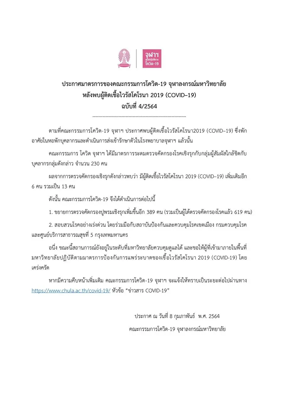เมื่อวันที่ 8 ก.พ.64 จุฬาลงกรณ์มหาวิทยาลัย ออกประกาศมาตรการของคณะกรรมการโควิด-19 จุฬาลงกรณ์มหาวิทยาลัย หลังพบผู้ติดเชื้อไวรัสโคโรนา 2019 (COVID–19)ฉบับที่ 4/2564 ความว่า