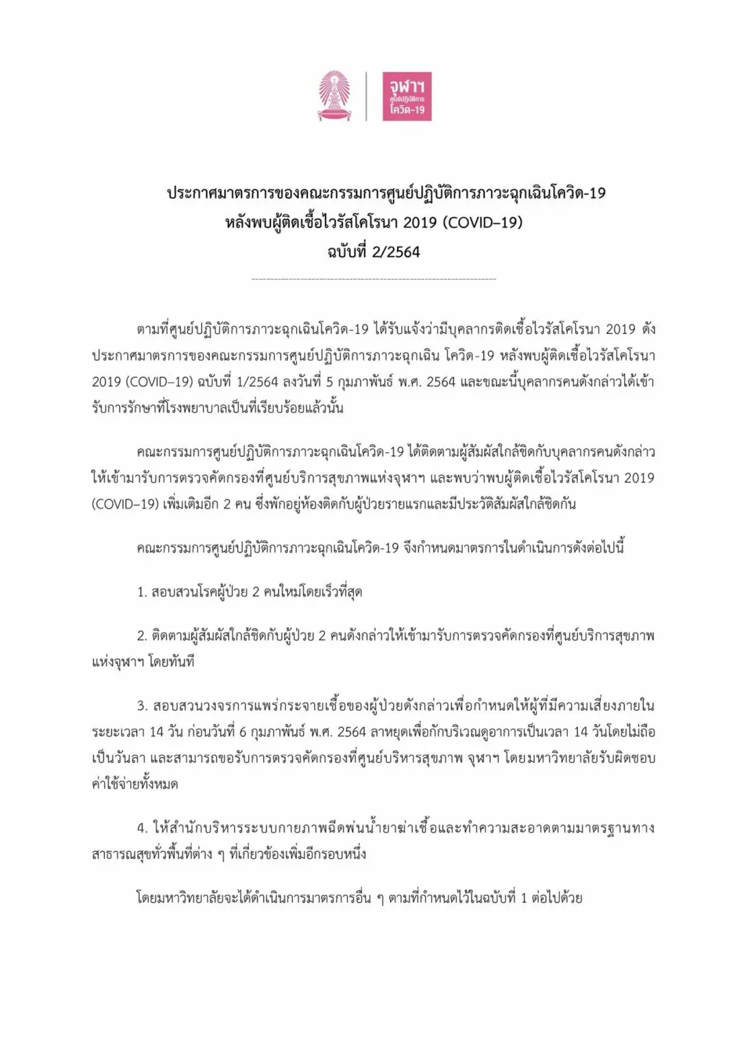 7 ก.พ. 64 จุฬาลงกรณ์มหาวิทยาลัย ออกประกาศมาตรการของคณะกรรมการศูนย์ปฏิบัติการภาวะฉุกเฉินโควิด-19 หลังพบผู้ติดเชื้อไวรัสโคโรนา 2019 (COVID–19) ฉบับที่ 2/2564
